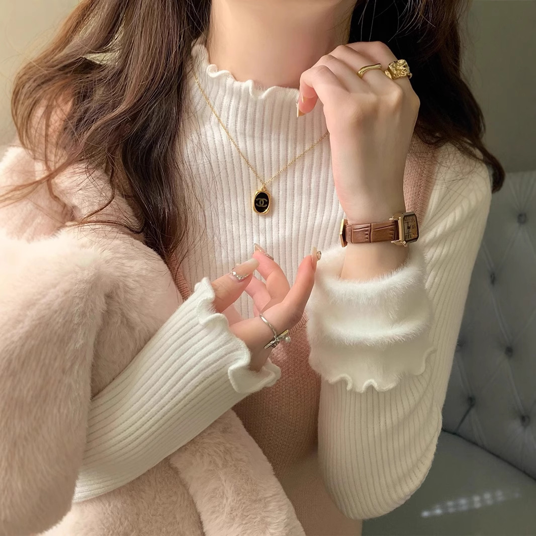 ベルベットの厚い一体ベルベットのニットシャツの女性の木の耳元の半高襟のセーター秋の冬の長袖の中にセーターを着る
