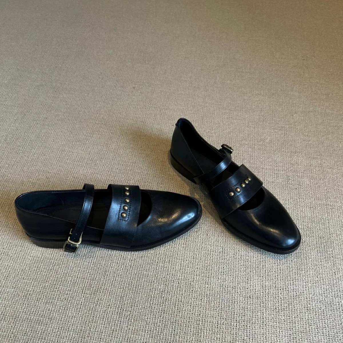 本革フランス高級感ドリルT字バックル角頭浅口平底メアリー珍単靴女子春秋単靴
