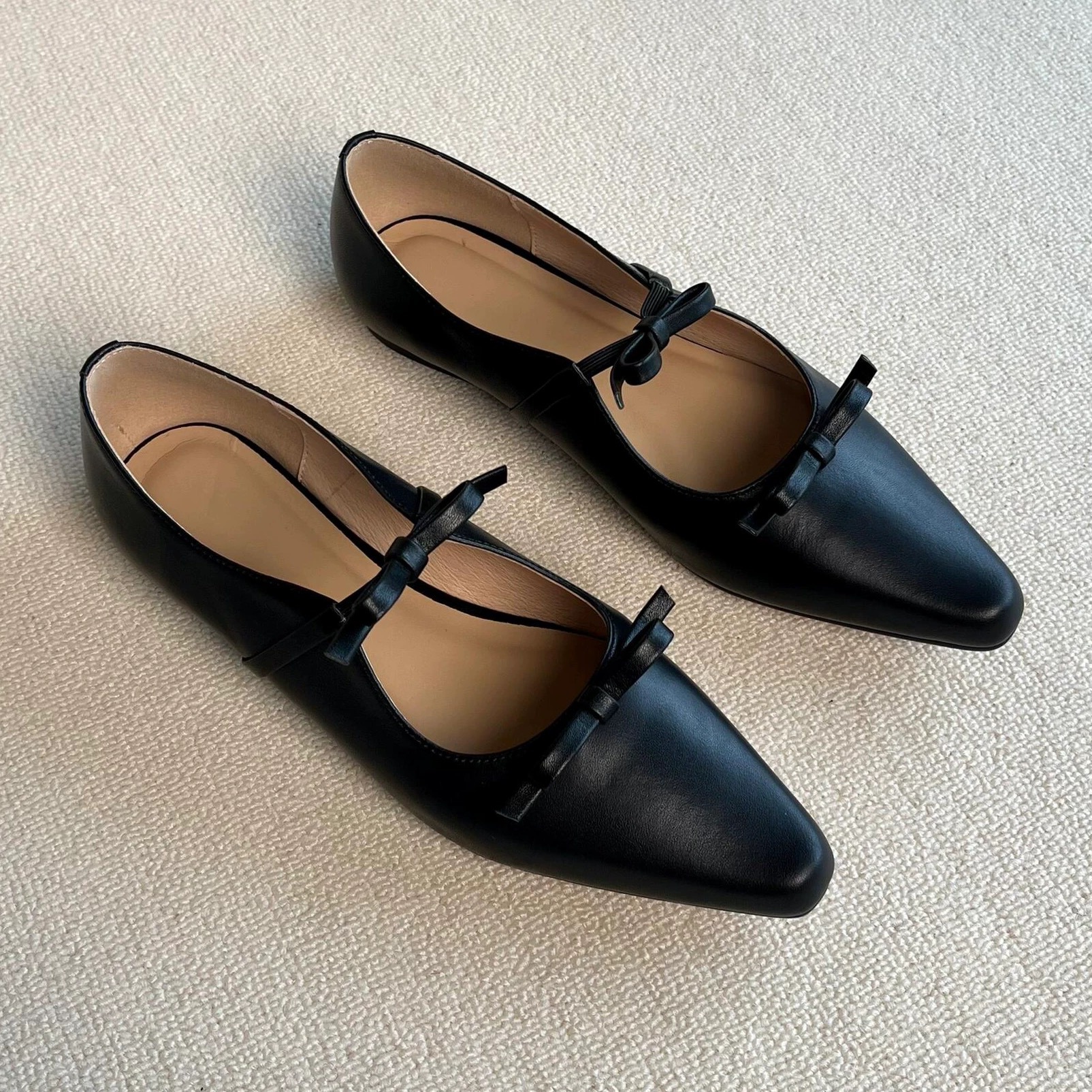 本革フランスの尖った口の浅い蝶結びの平底の靴の女性2025春の新型の百合のメアリー珍の小さい靴