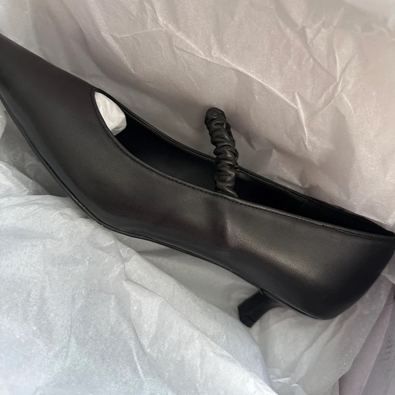 本革のフランス式の先の細いかかとの浅い口の1字は靴の女性の2025新型の春の夏の気質の猫とハイヒールを持ちます。