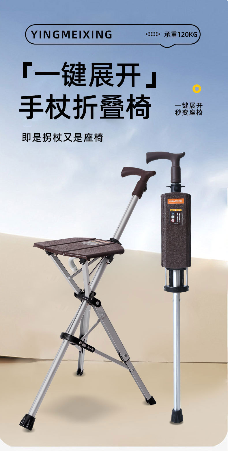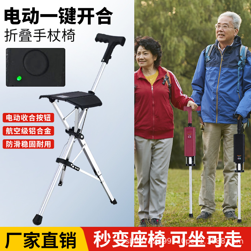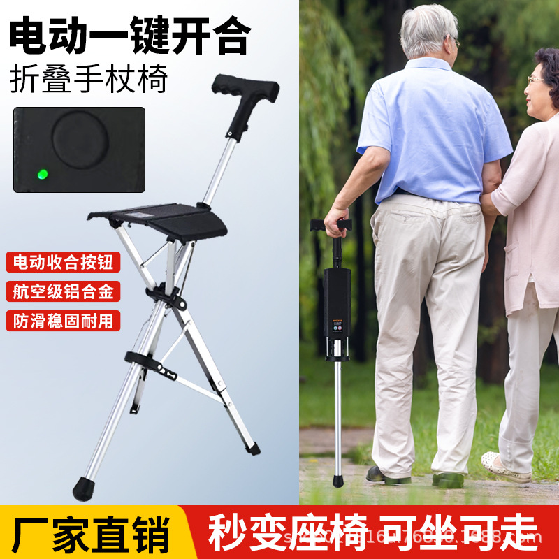 跨境电动一键开合拐杖凳全自动老人折叠椅便携式手杖椅户外随身椅
