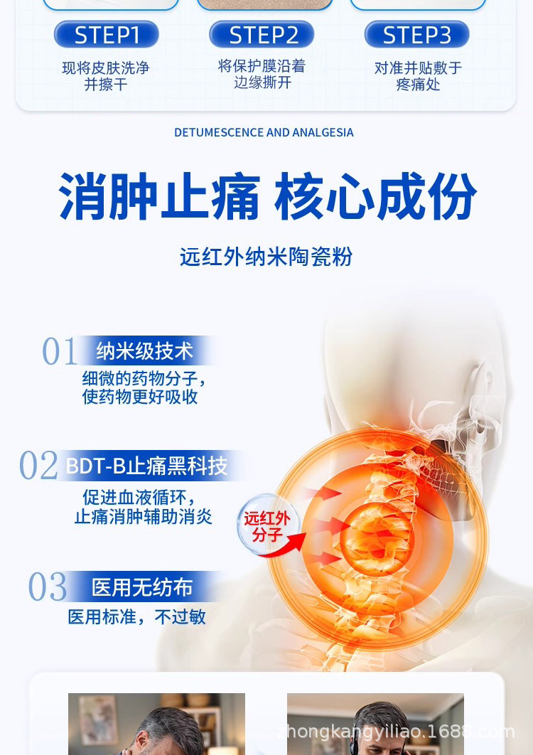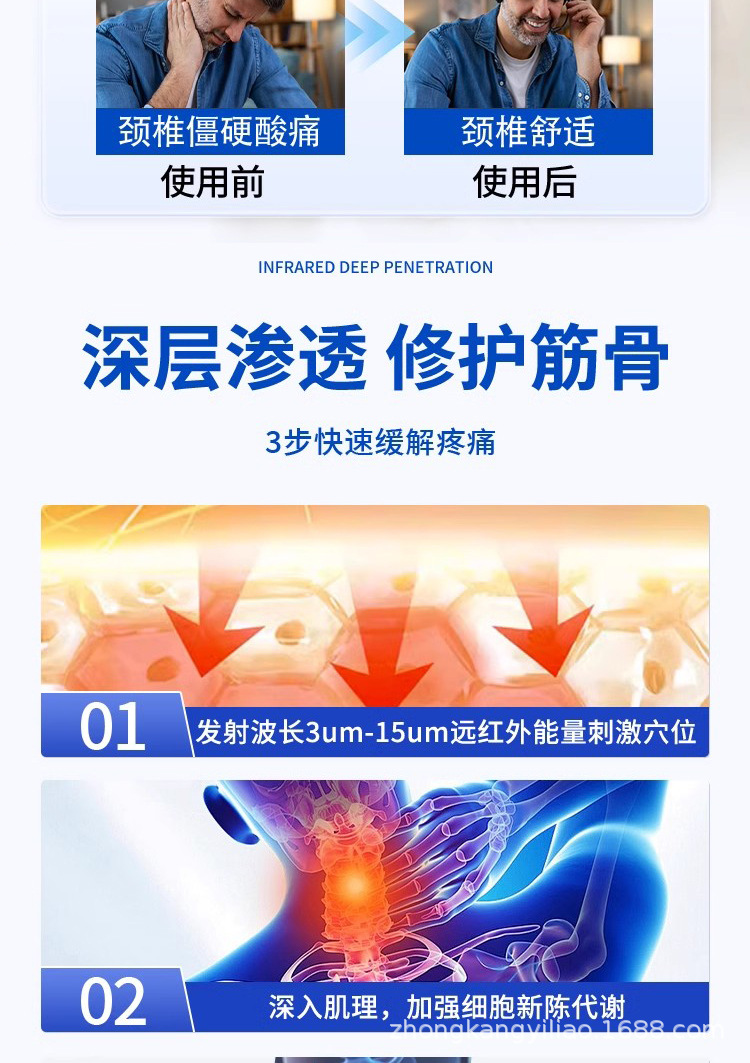 適用範囲 局所的な血液循環を促進し、抗炎症、腫れ、痛みを軽減します。頸椎、肩周り、腰椎、膝、脚、関節、軟部組織の損傷や痛みに適しています。