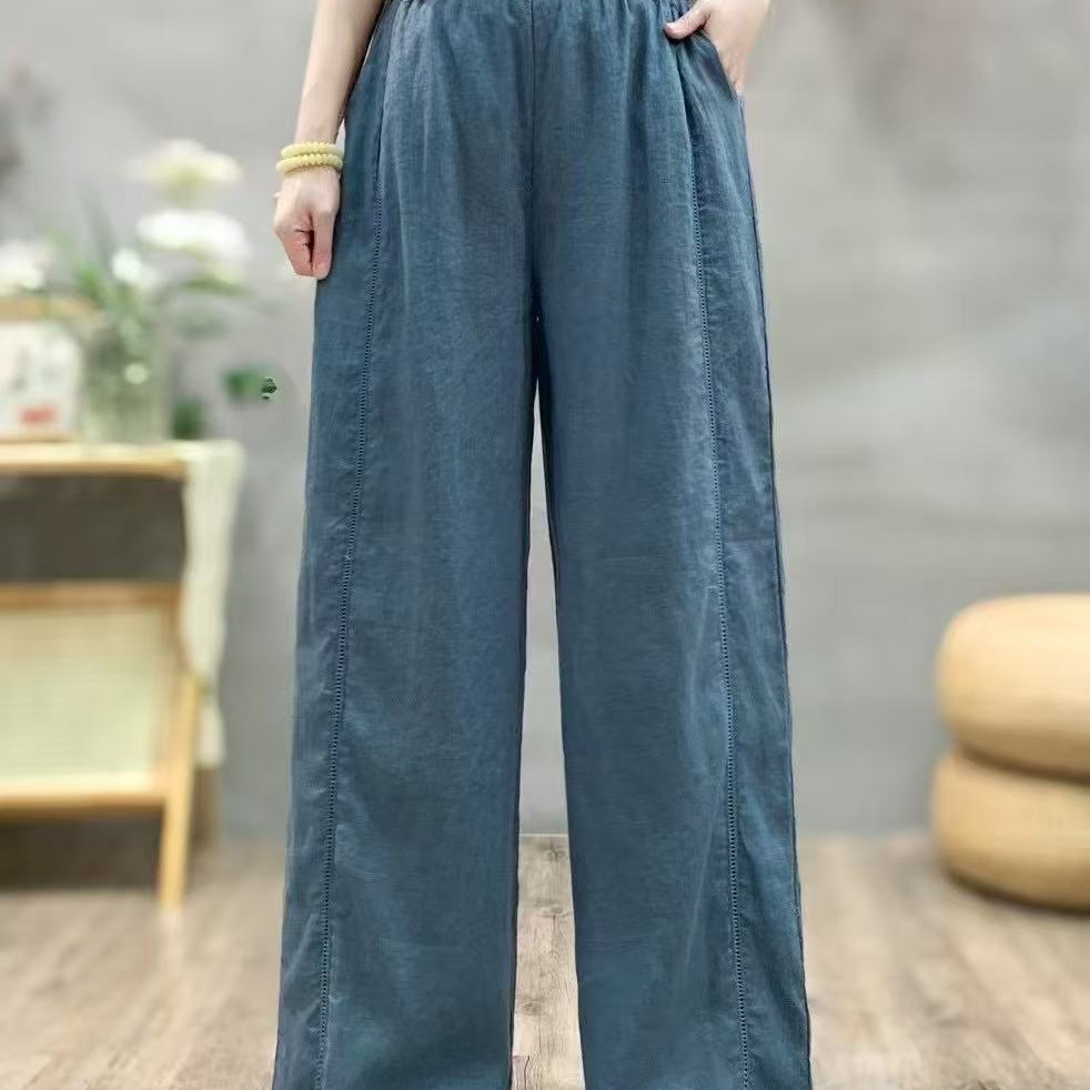 25年夏カジュアルパンツレディースエスニック風リネンストレートパンツレトロ文学カジュアルパンツウエストゴムリネンパンツ薄手