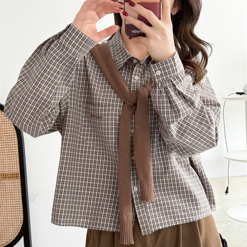 26年格子衬衫长袖女刺绣新款衬衣宽松休闲韩版学院风上衣显瘦衬衫