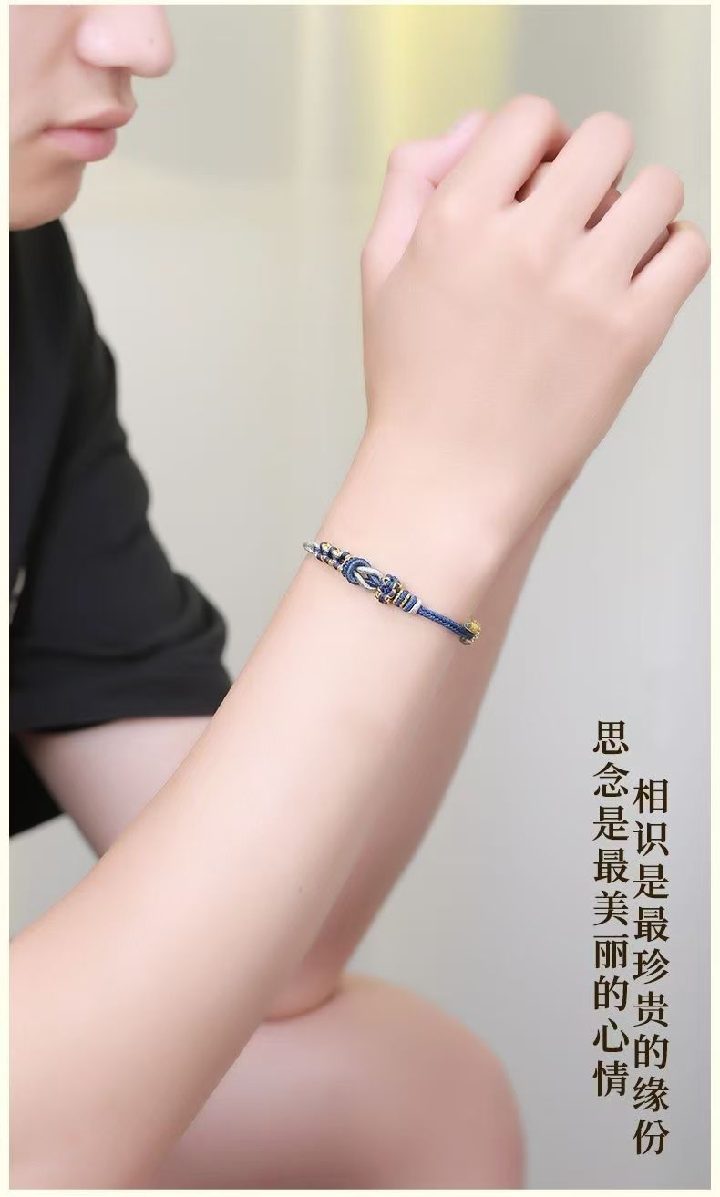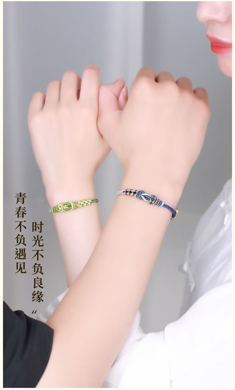 莫相は手の縄を離れて赤い縄のカップルのブレスレットを編みます。