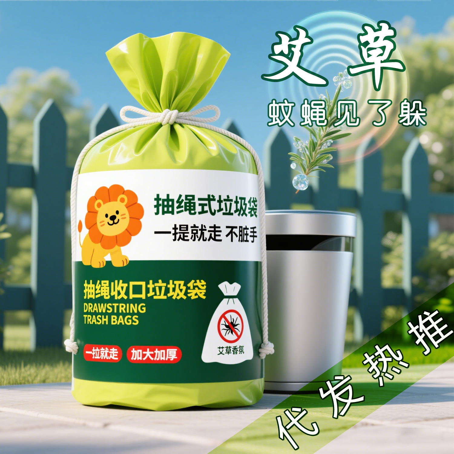 抽绳垃圾袋艾草驱蚊印花手提式抽绳特厚垃圾袋厨房加厚大号清洁袋
