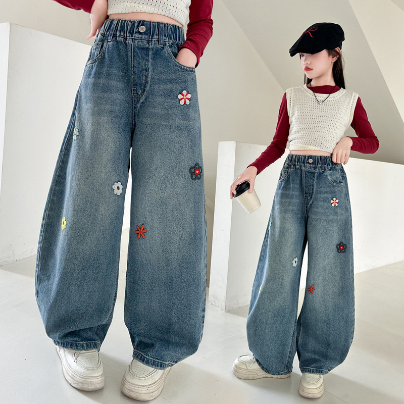 2025秋季女童牛仔裤童装中大童儿童春秋新女孩刺绣花朵弯刀裤长裤