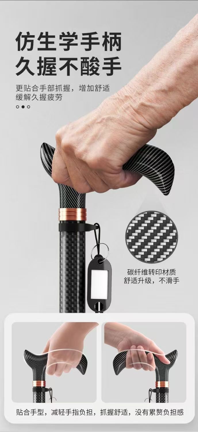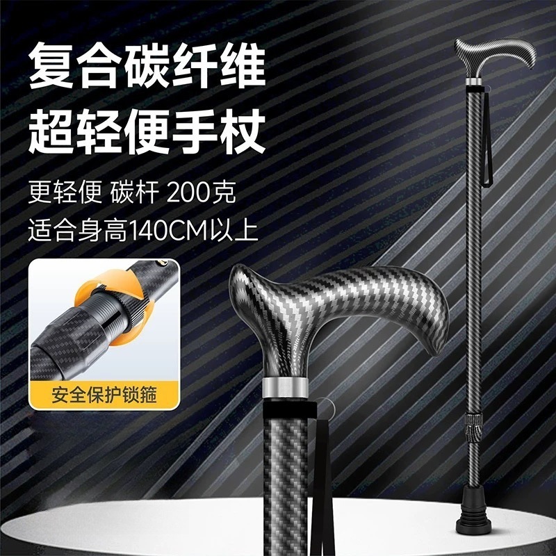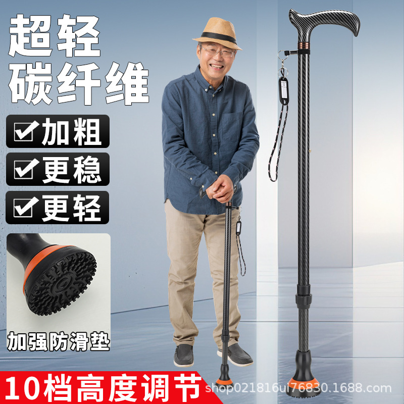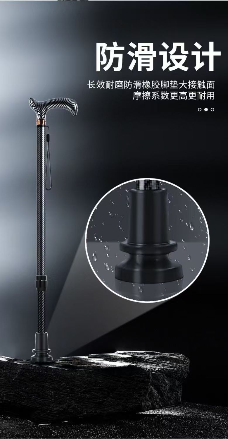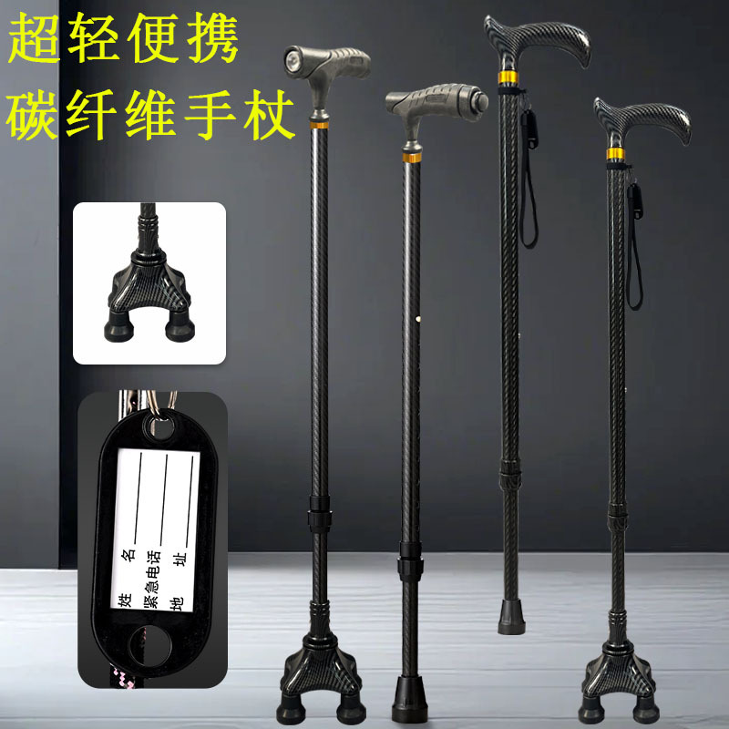 碳纤维老人拐杖防滑拐棍碳素手杖老年人用超轻四脚带灯登山杖代发