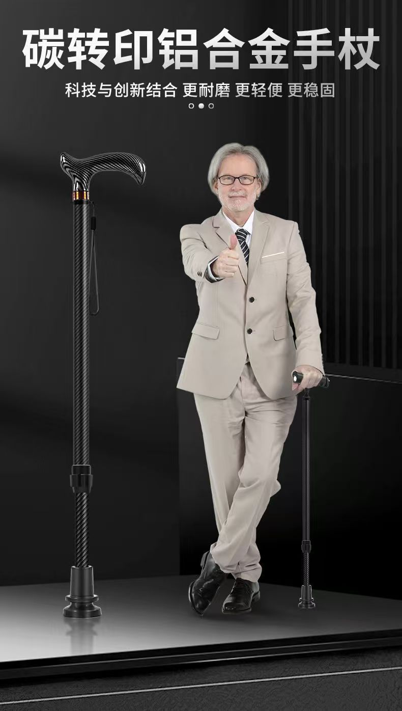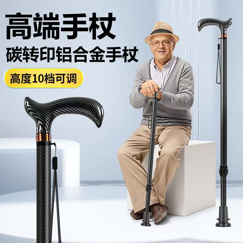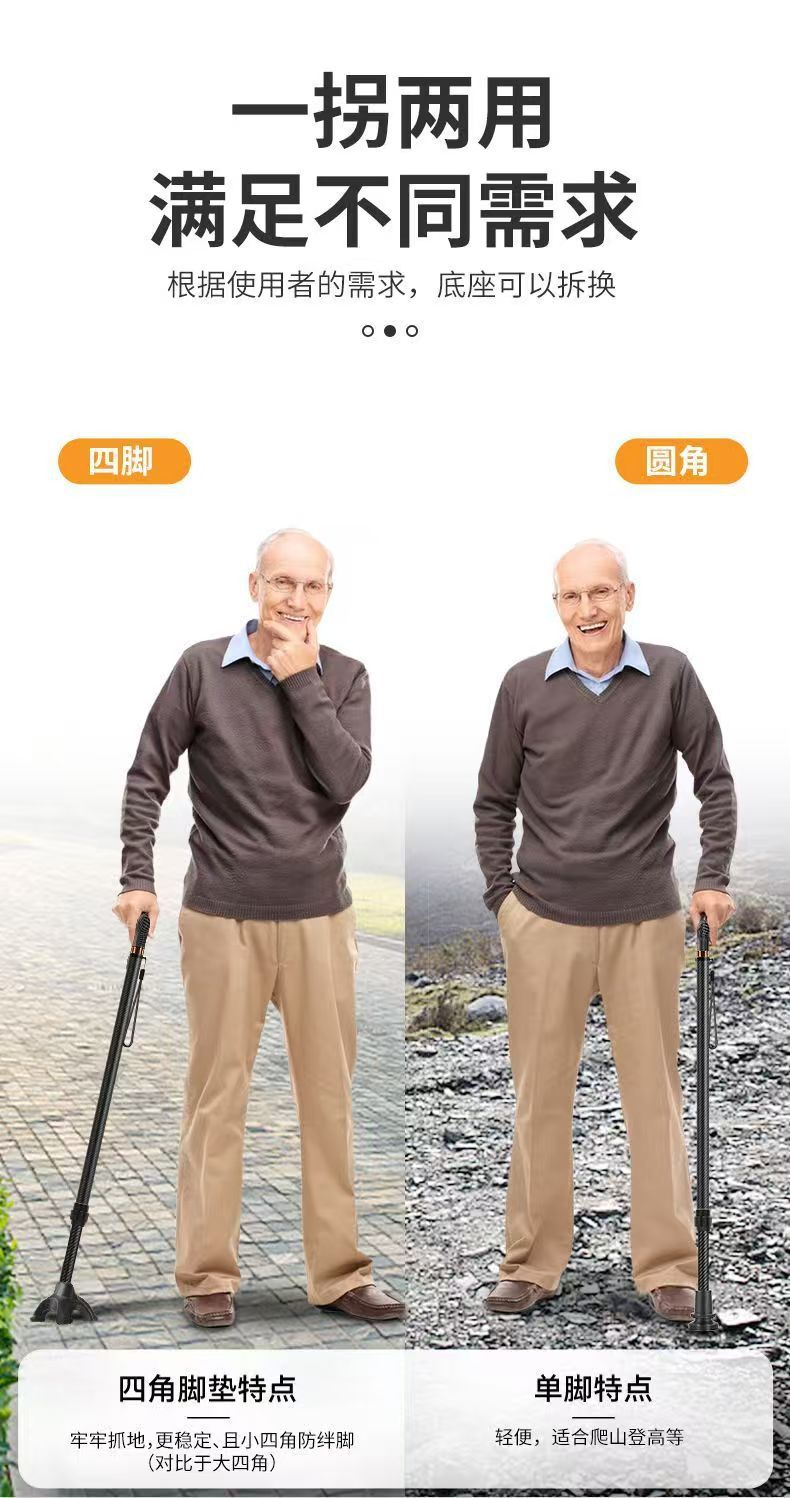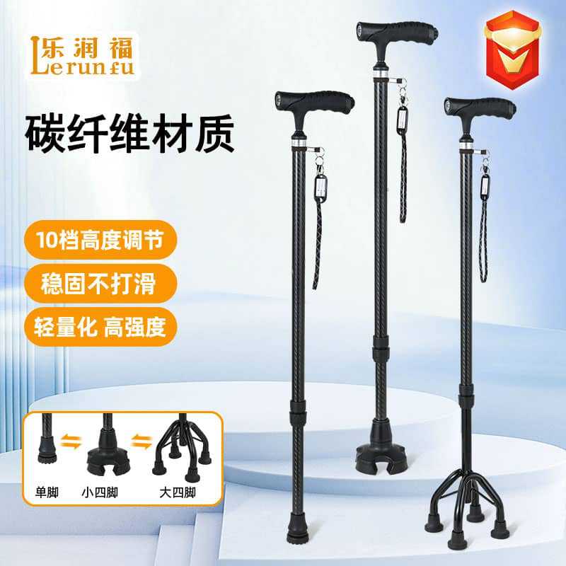 碳纤维老人拐杖防滑拐棍碳素手杖老年人用超轻四脚带灯登山杖代发