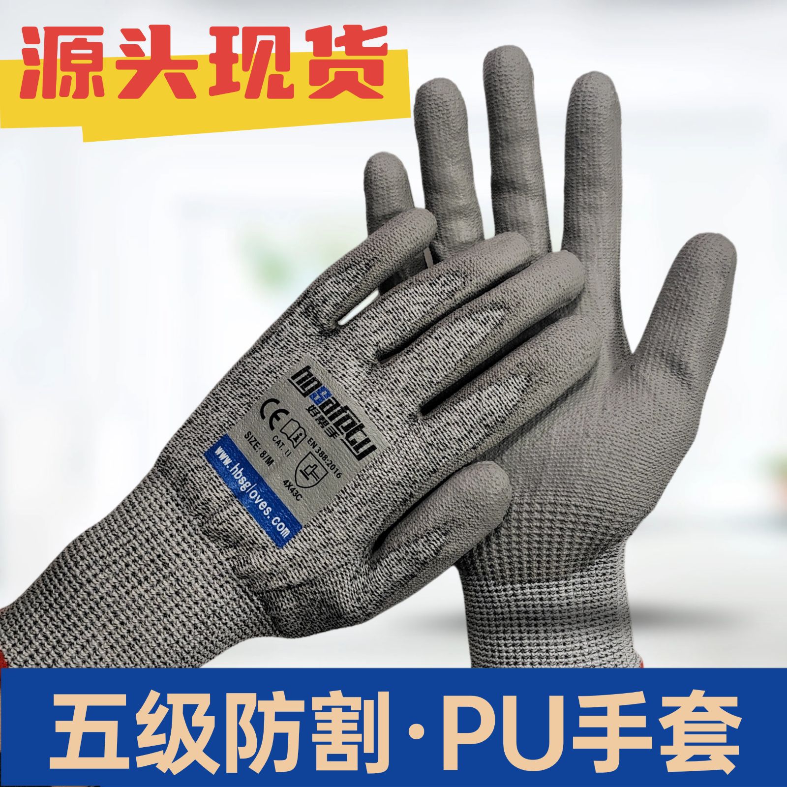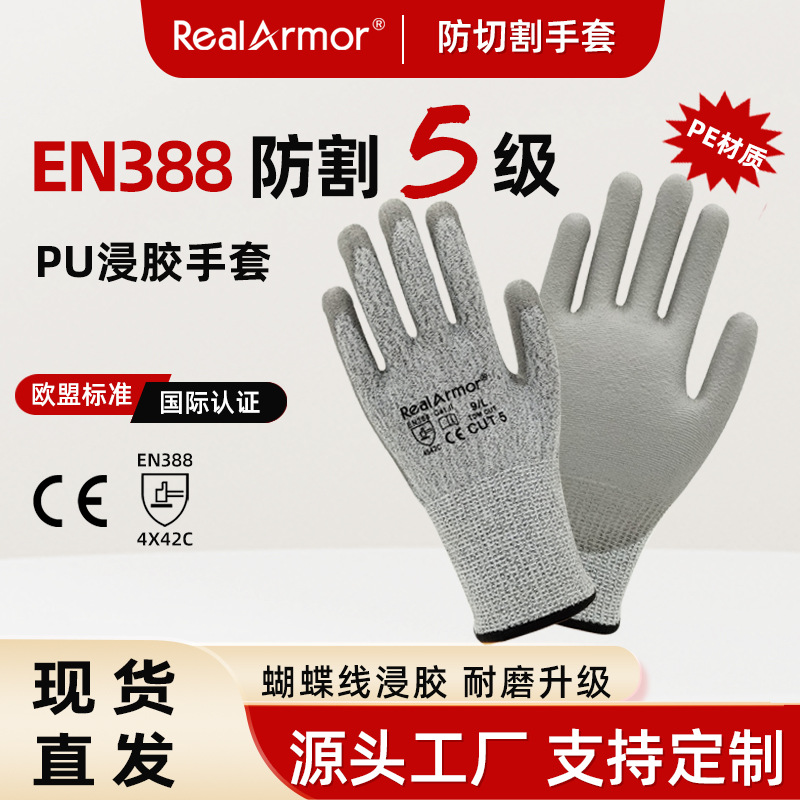 CE认证EN388防割5级PU涂层PE材质出口耐磨C级防切割手套透气防护