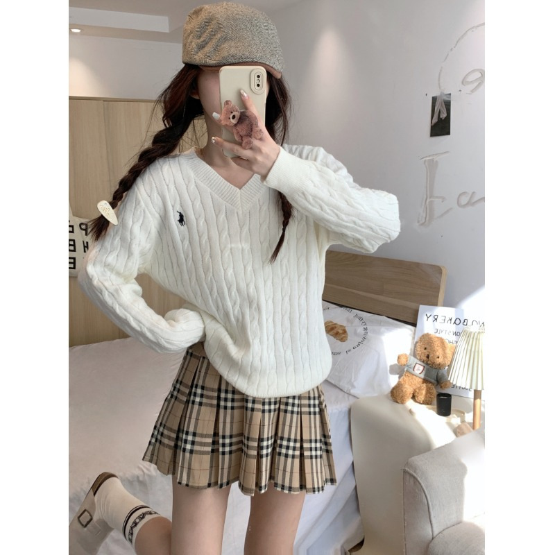 V领长袖女早秋冬新款复古刺绣针织上衣内搭外穿套头麻花毛衣