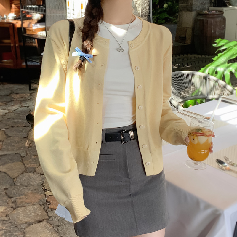 奶系温柔短款针织开衫女春秋气质内搭毛衣外套百搭减龄芥末黄上衣