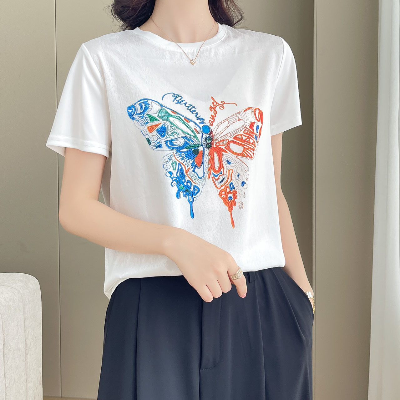 夏のファッション丸首半袖女性は痩せた気質を見せて、痩せたサテンをつなぎ合わせて半袖で痩せている
