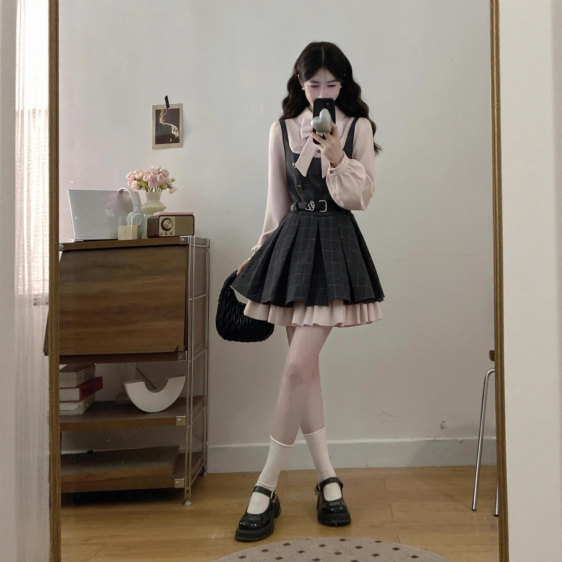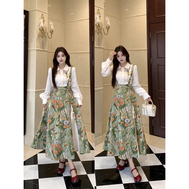 大码胖mm法式拼接设计感减龄长袖衬衫女秋季印花背带裙两件套