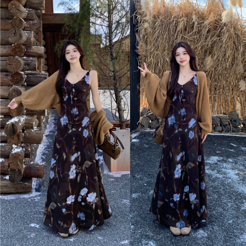 大码早秋复古印花优雅显瘦V领吊带连衣裙慵懒毛衣开衫两件套