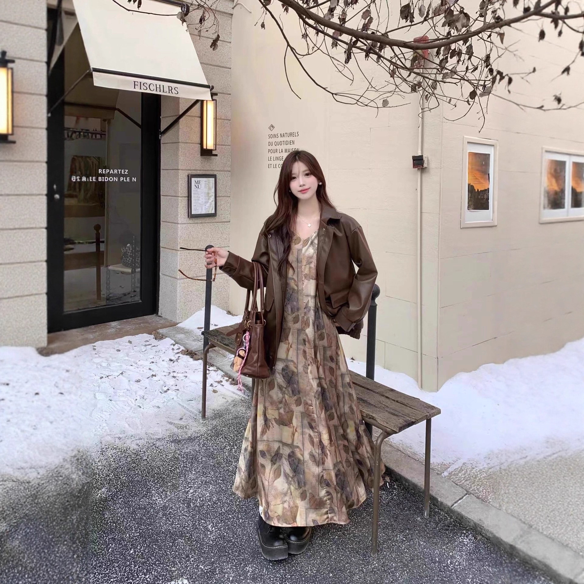 大码女装秋季时尚穿搭翻领复古皮衣外套中式印花吊带裙两件套