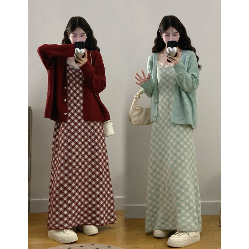 大码女装秋季新款韩系慵懒风毛衣外套+格子针织背心裙两件套