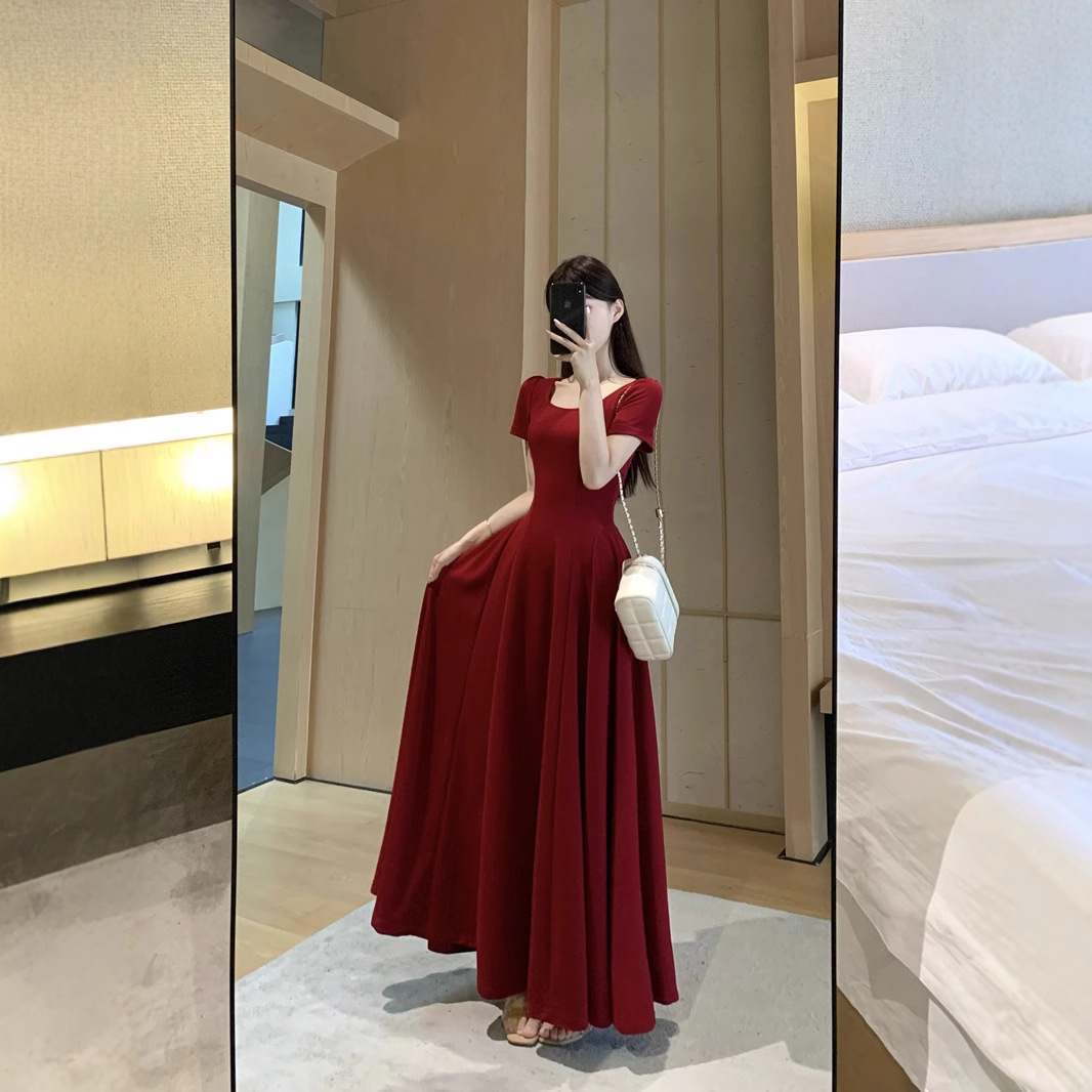 赤い方襟半袖ワンピース女性2025夏優雅気質フランス腰A字大振り子スカート高腰ロングスカート