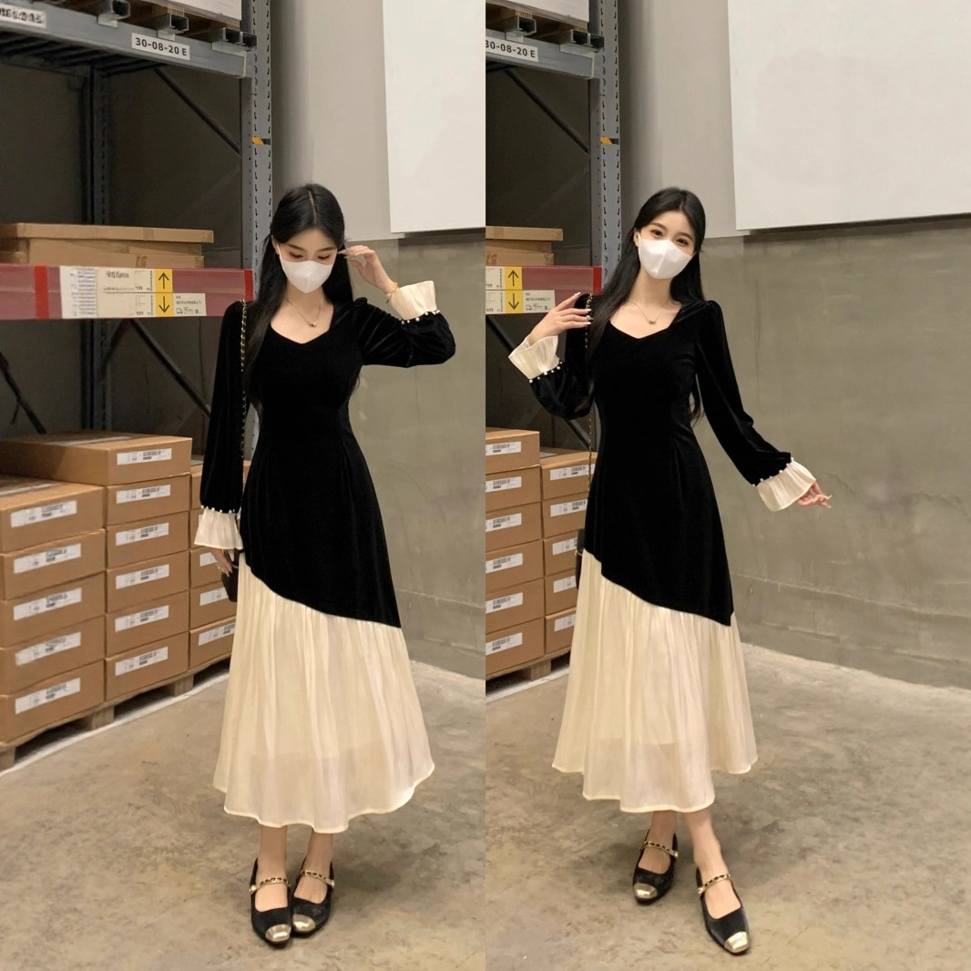 大码女装胖mm法式方领丝绒连衣裙2025秋冬新款拼接收腰遮肉裙子