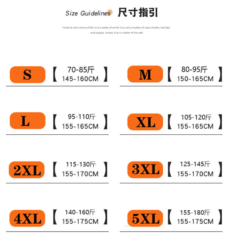 サイズ M は 40-47.5kg をお勧めします,L は 47.5-55kg をお勧めします,XL は 52.5-60kg をお勧めします,2XL 推奨 57.5-65kg,3XL 推奨 65-72.5kg,4XL 推奨 72.5-82.5kg,5XL 推奨 82.5-100kg