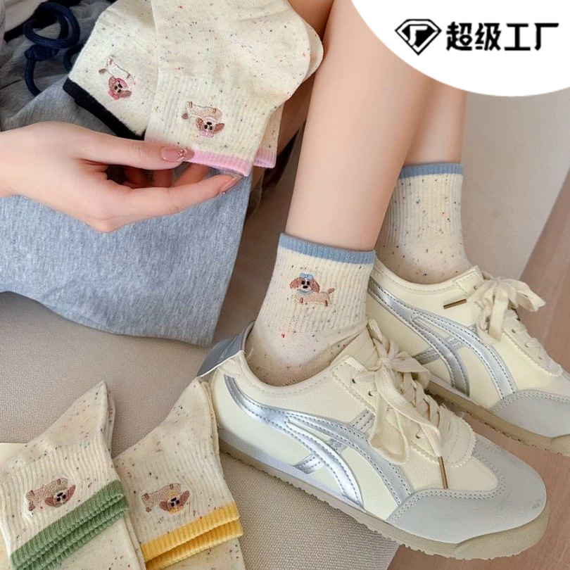夏薄手のレディースソックス、韓国風刺繍子犬2025春夏新作足ファッションコーマ