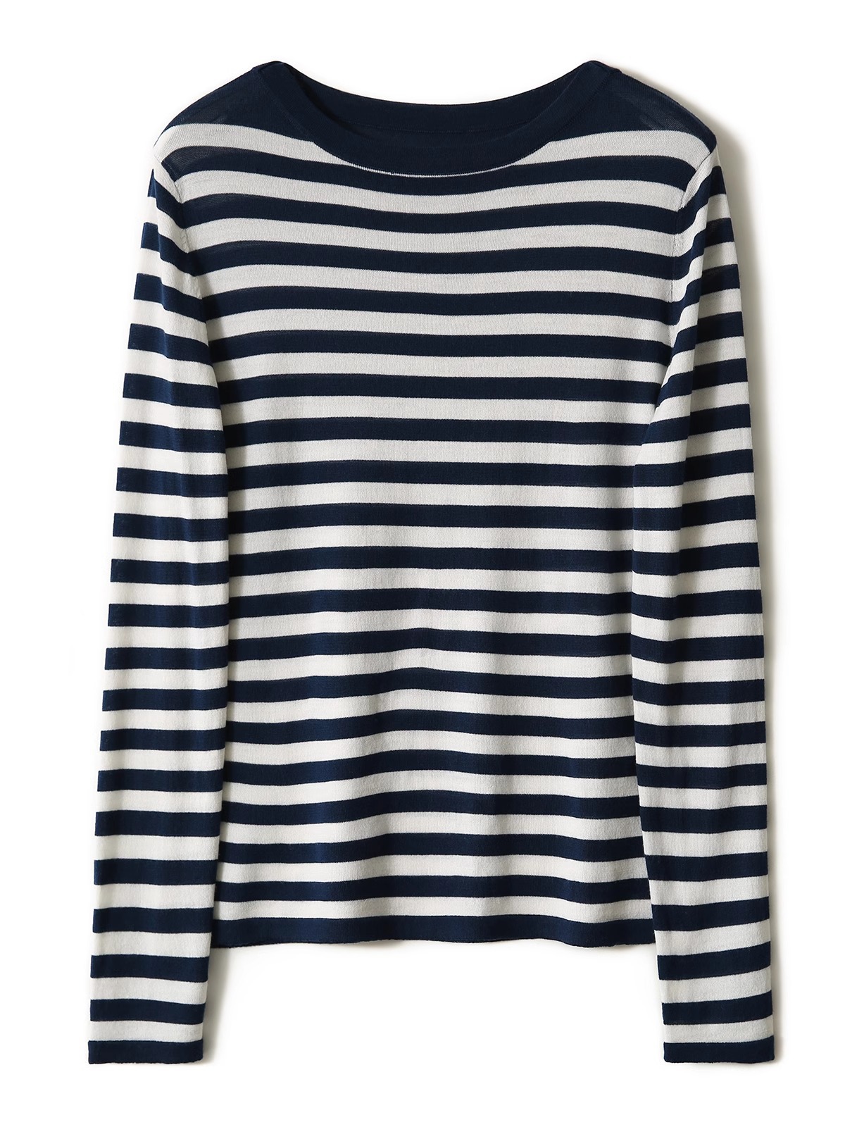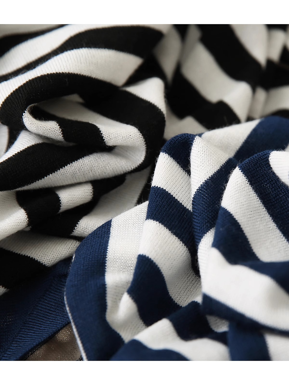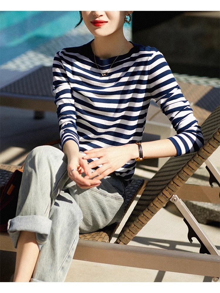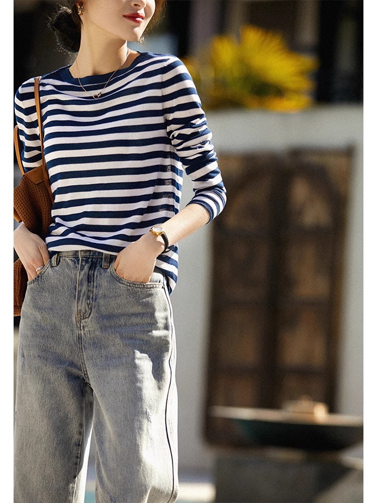 2025春の新型の丸襟の長袖のカジュアルな柔らかい年齢の縞のセーターのニットの女性の底のシャツ