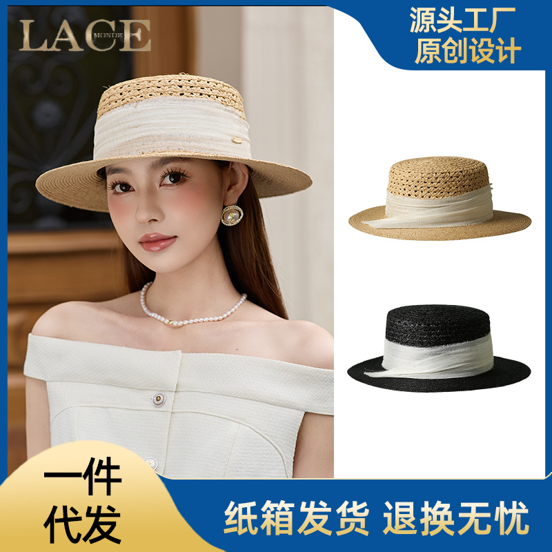 2025 フレンチ中空ラフィアフラットトップ夏ハイエンド旅行海辺サンシェード通気性麦わら帽子卸売カスタマイズ