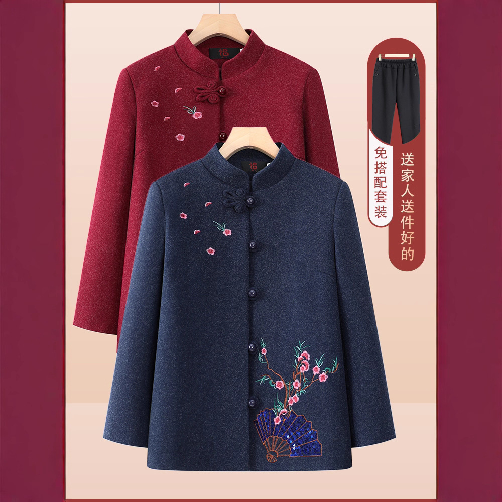 中式唐装奶奶装外套70岁中老年人女装春装夹克妈妈刺绣呢子上衣服
