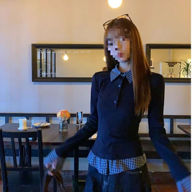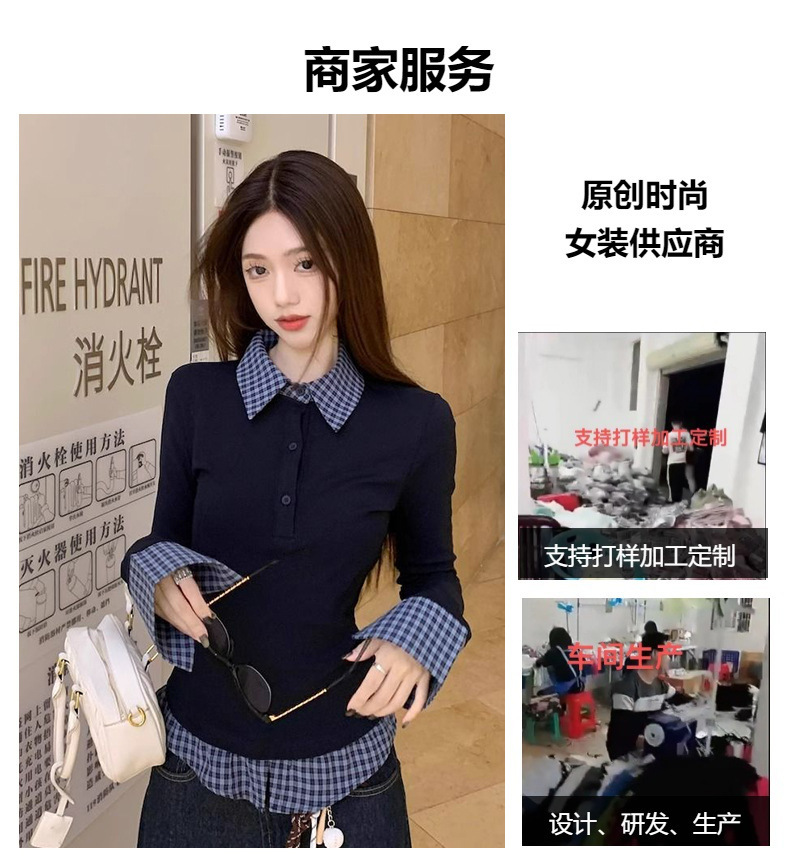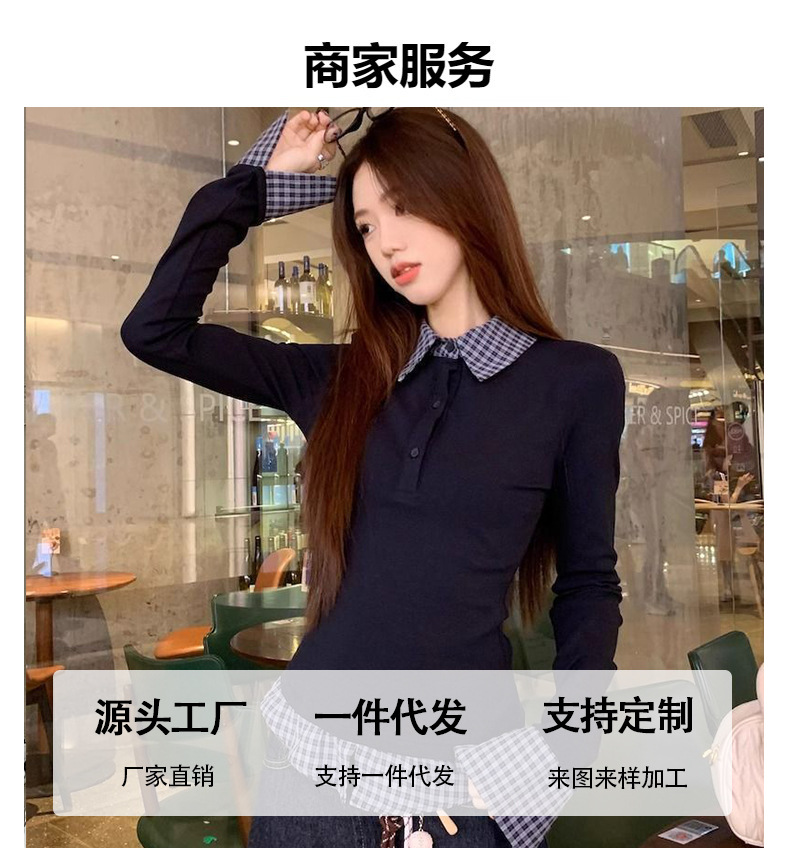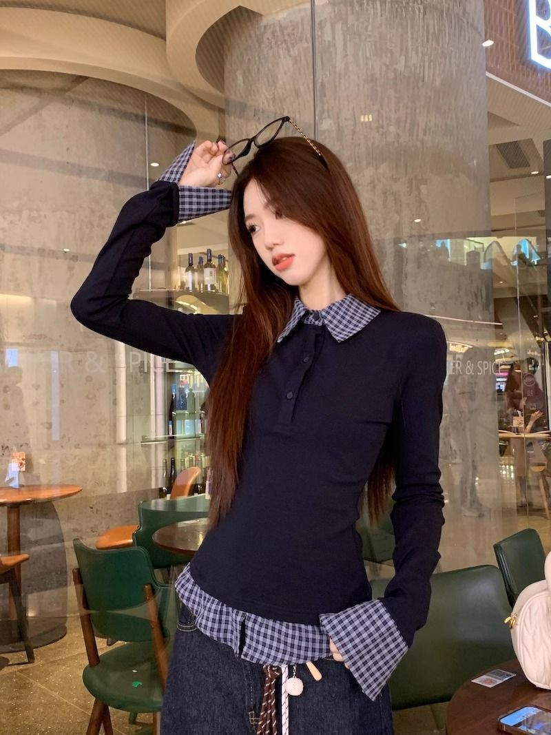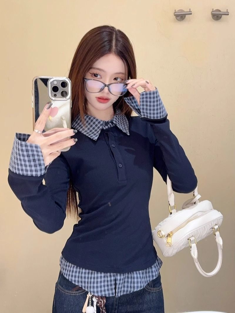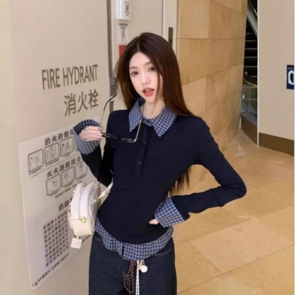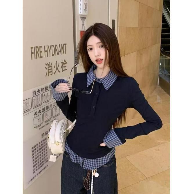 韓国系の偽の2つの格子はpoloの襟の長袖のtシャツの女性の春の新型のデザイン感をつなぎ合わせます。