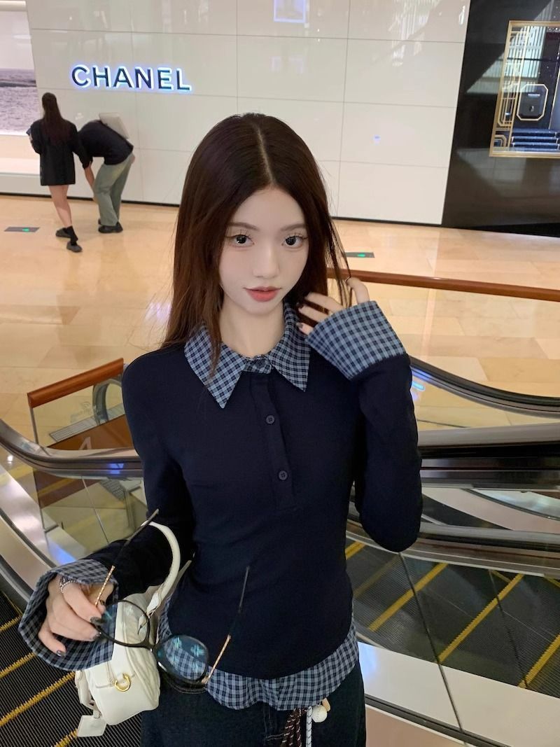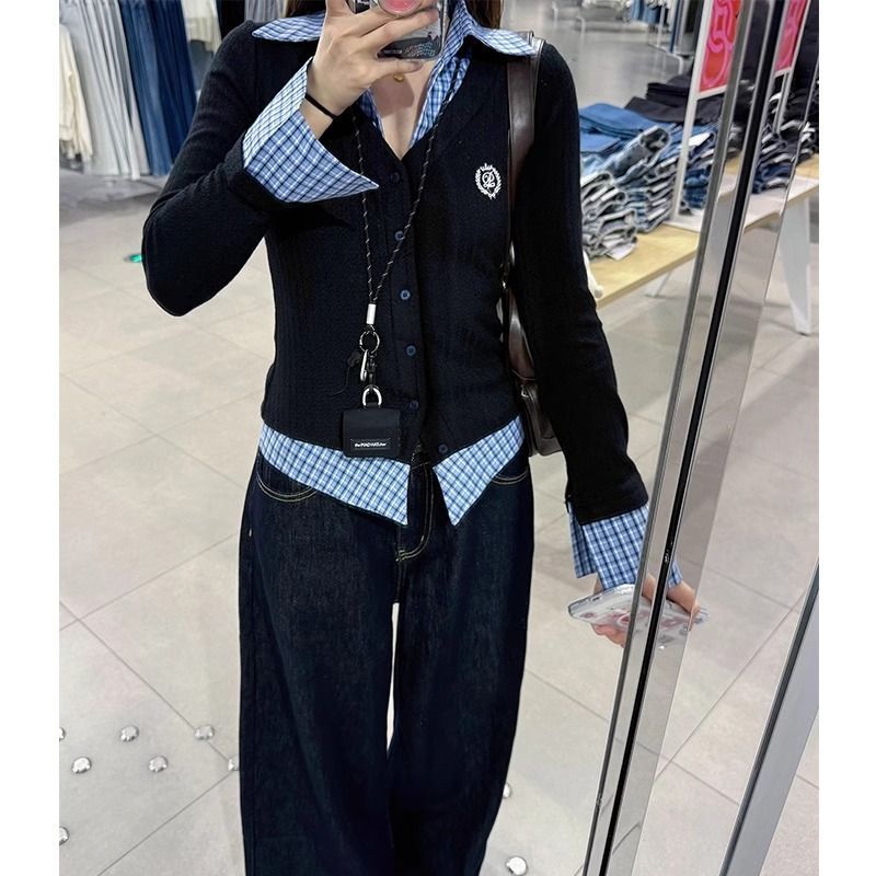 假两件长袖女2025春秋新款设计感格子拼接春秋开衫上衣