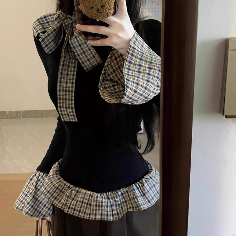 格子蝴蝶结假两件打底衫女春秋冬内搭设计感小众长袖修身收腰上衣