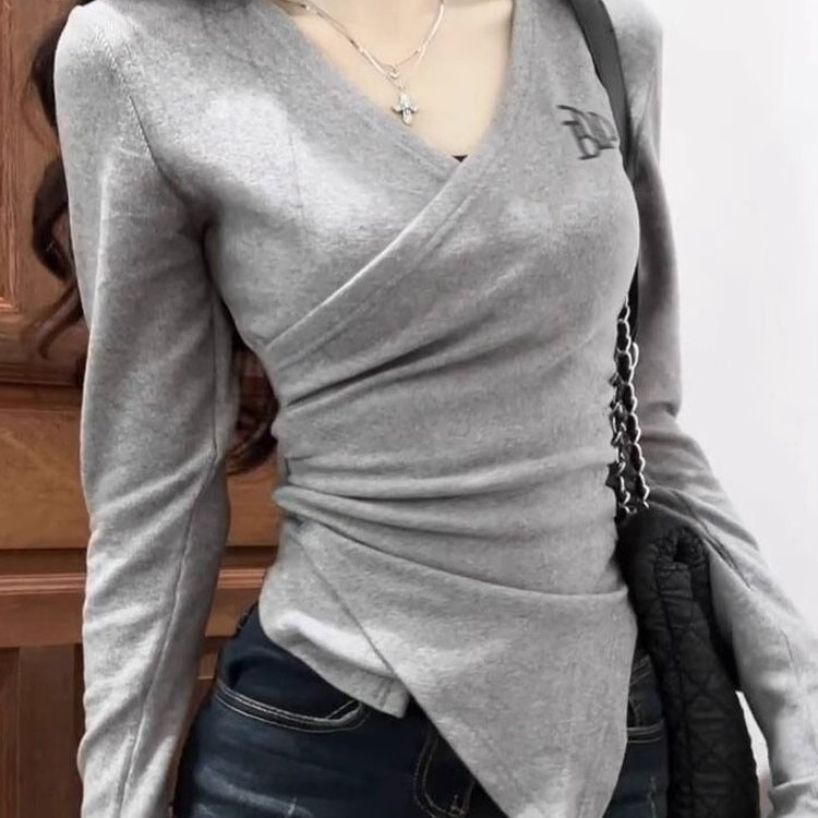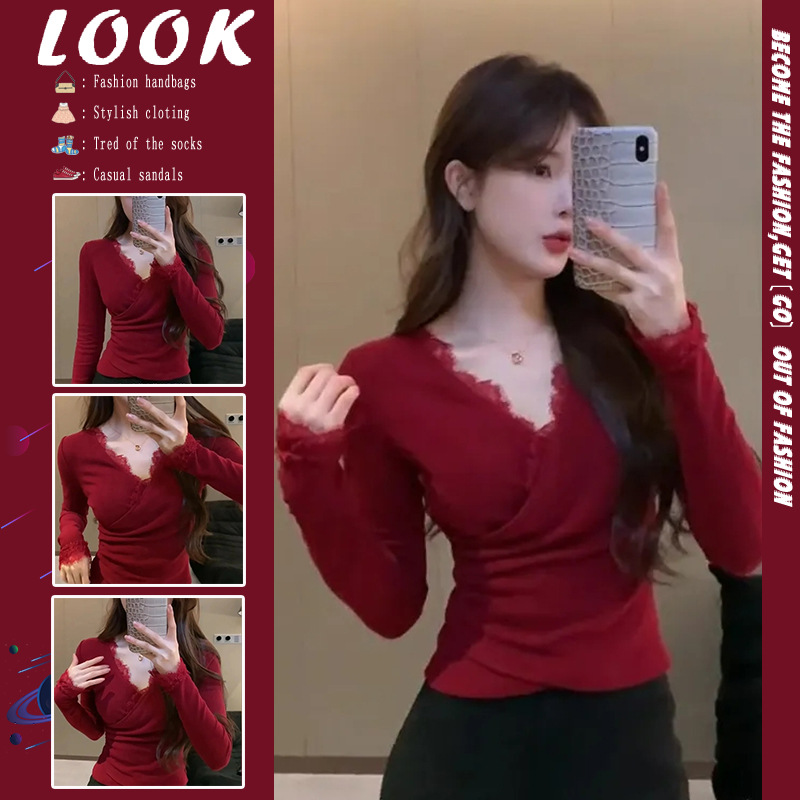 フランスレースはvネッククロスtシャツの女性秋冬の新型の大衆デザイン感をつなぎ合わせて、底のシャツに服を着ます。