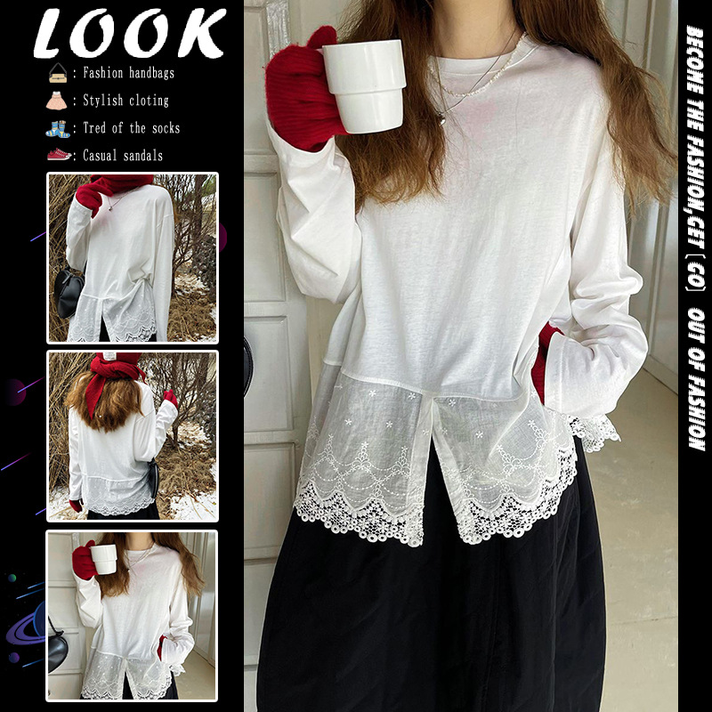 白のつなぎ合わせはフォークレースの長袖tシャツの底のシャツの女性の秋冬の中で合わせて2024の新型の上着を着ることができます。
