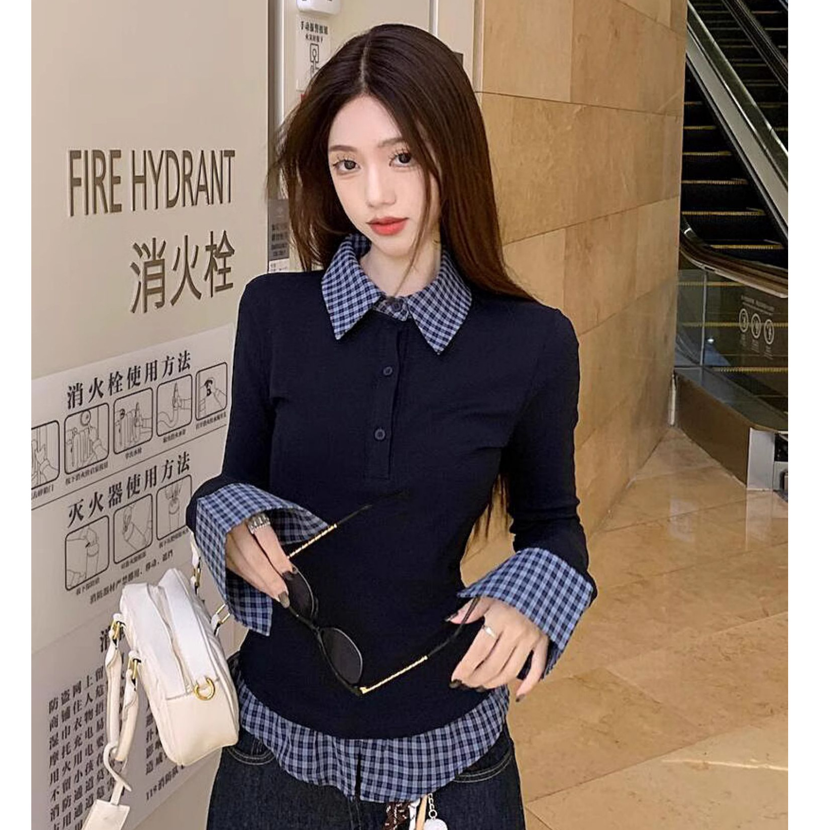 Polo领假两件女式衬衫春秋季ins设计感修身显瘦长袖T恤打底衫上衣