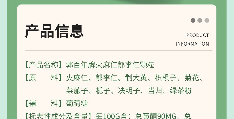 主な原料 麻仁、ユウ・リーレン、製造大黄、子、菊、ライ子、クチナシ、カッシア種子、アンジェリカ、緑茶粉末