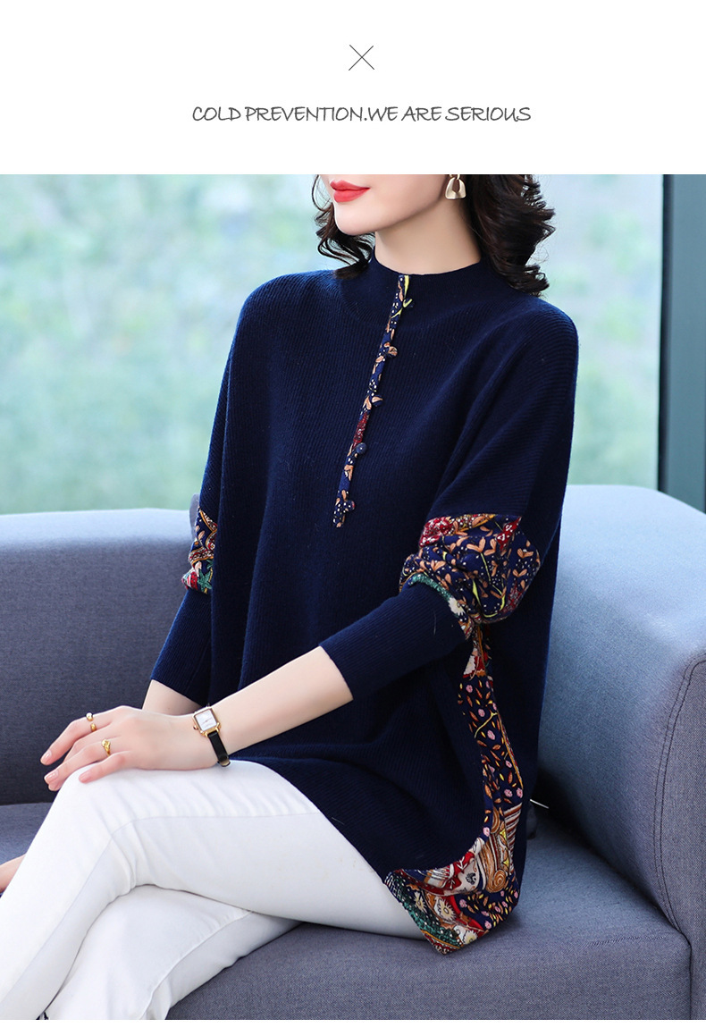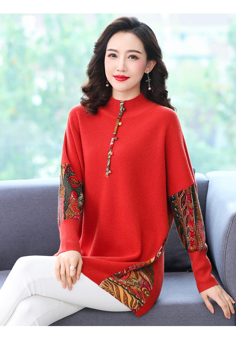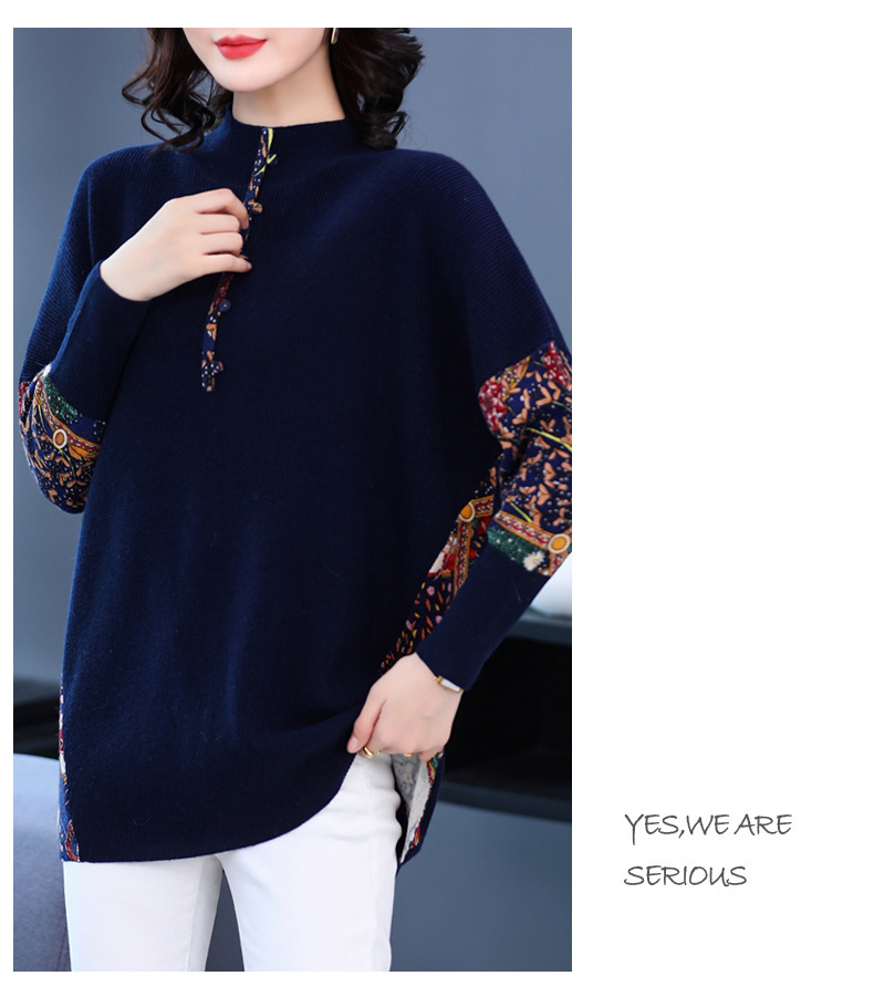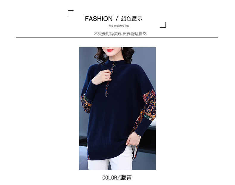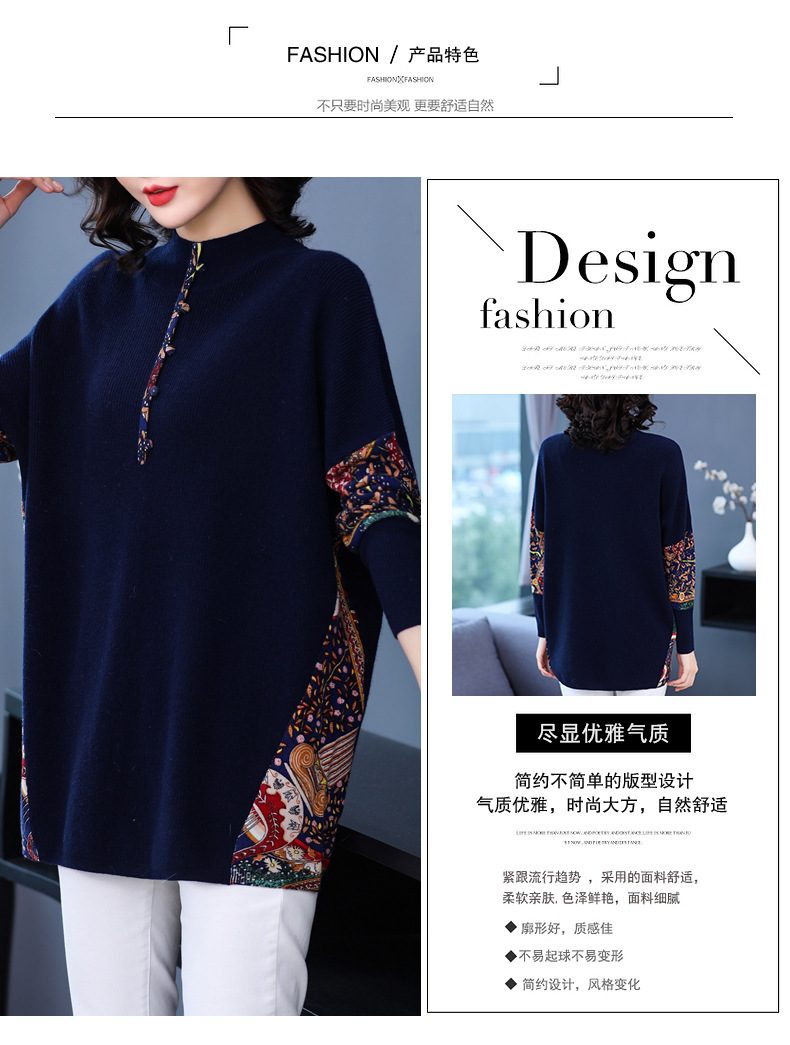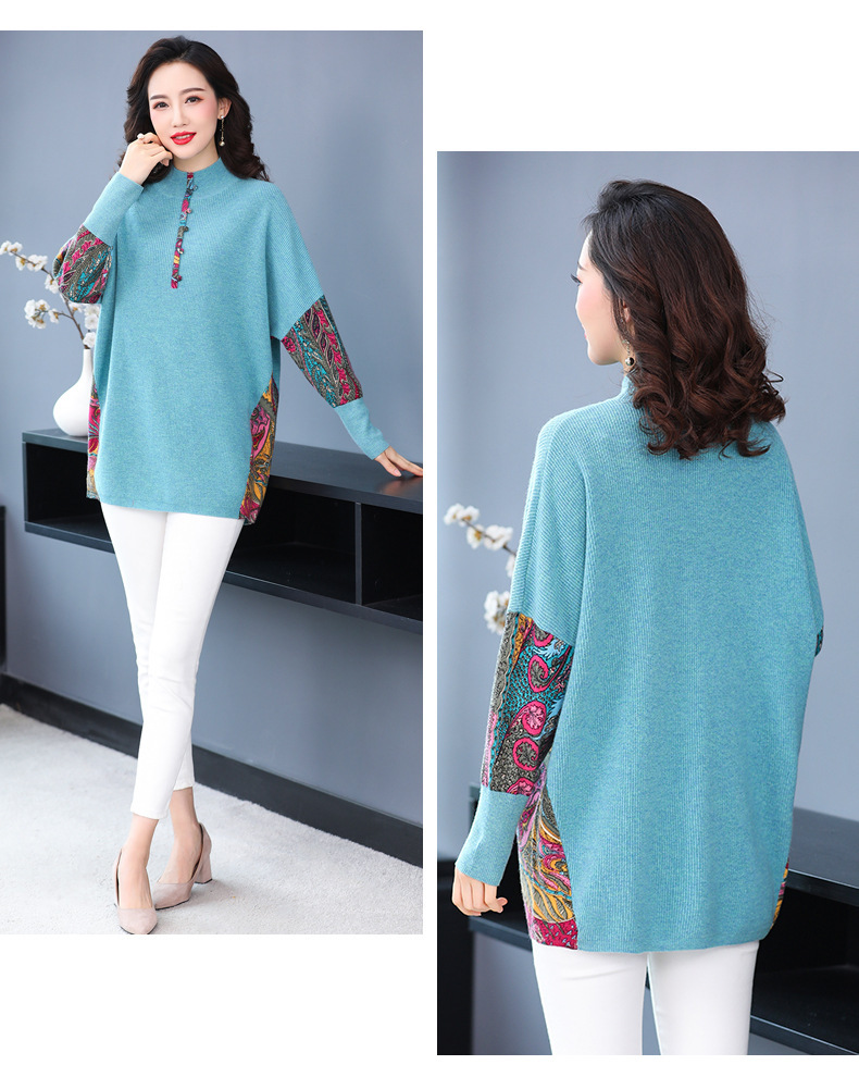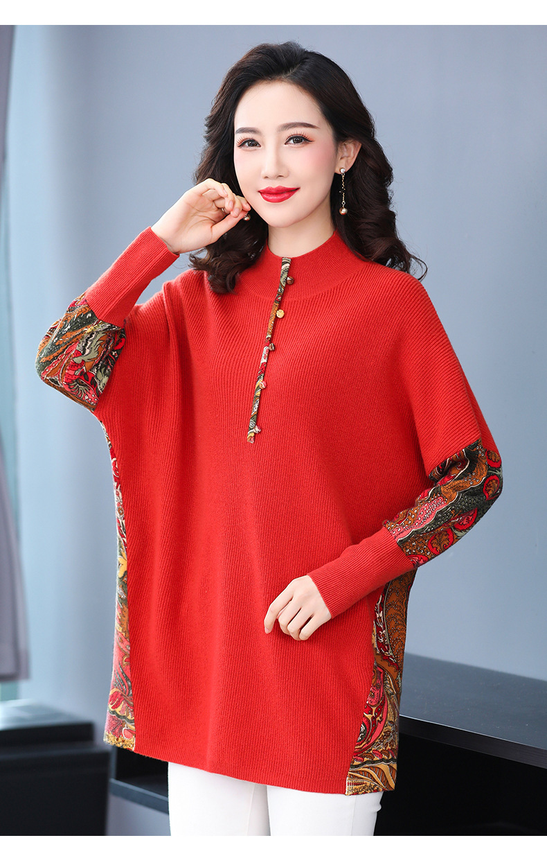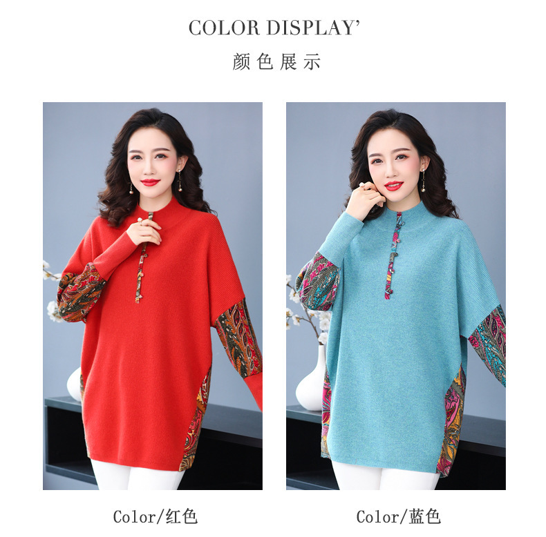 秋冬の中のミディアムニットの女性の中年のお母さんのコウモリの袖のプリントのセーターの大きいサイズのゆったりしている底のシャツの上着