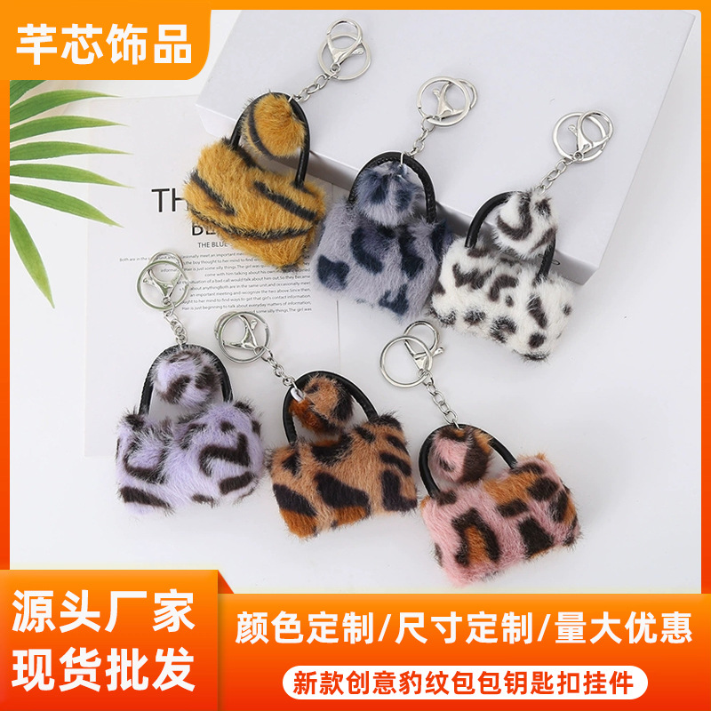 新款豹纹毛绒小包包汽车钥匙扣挂件创意时尚迷你小包挂饰配件批发