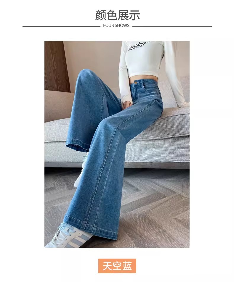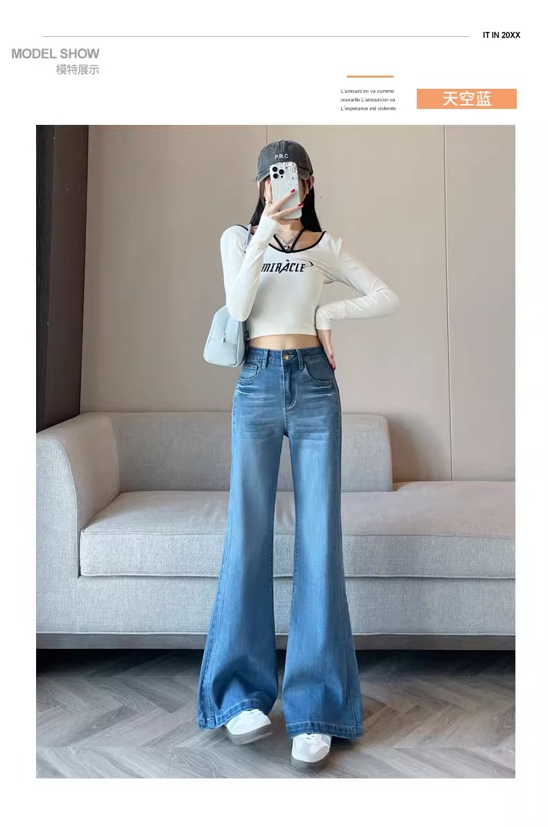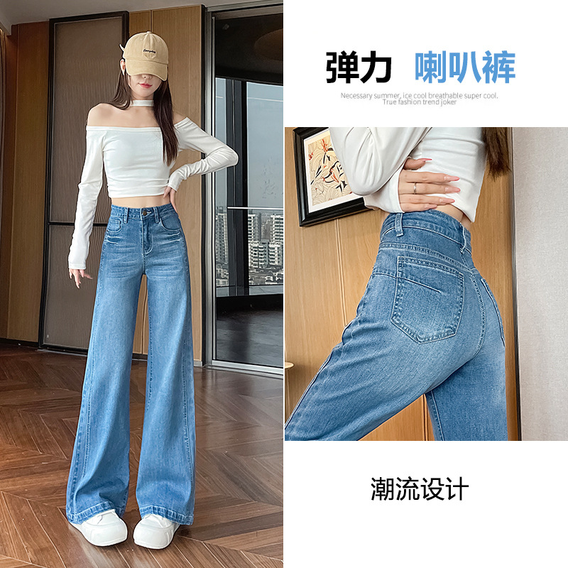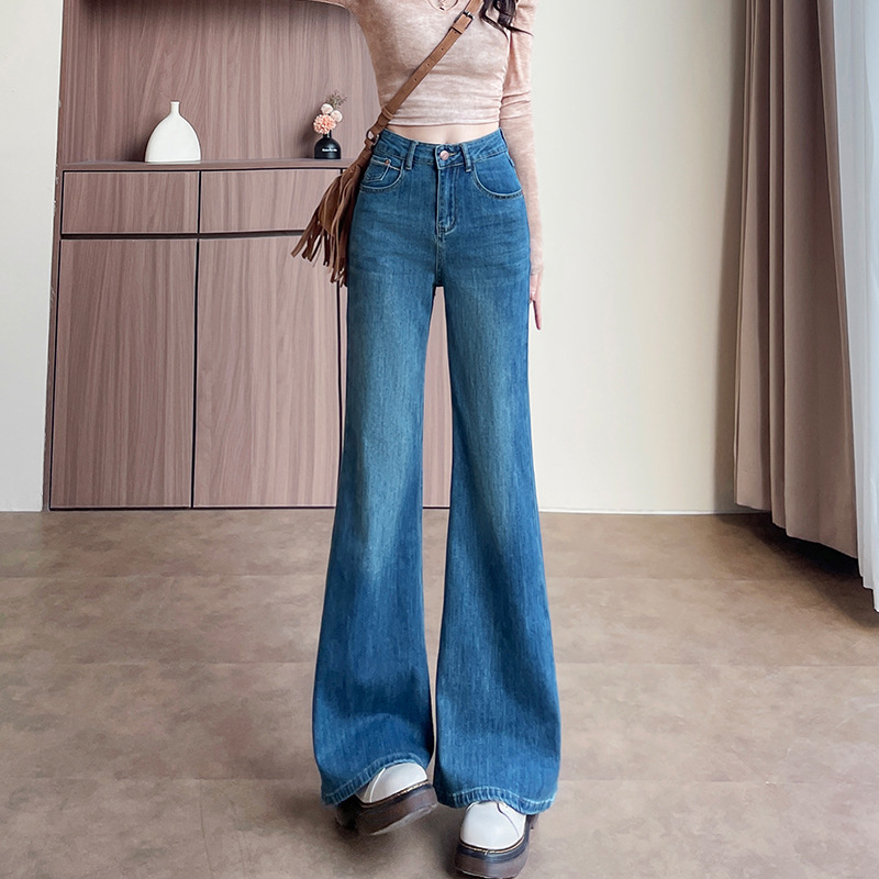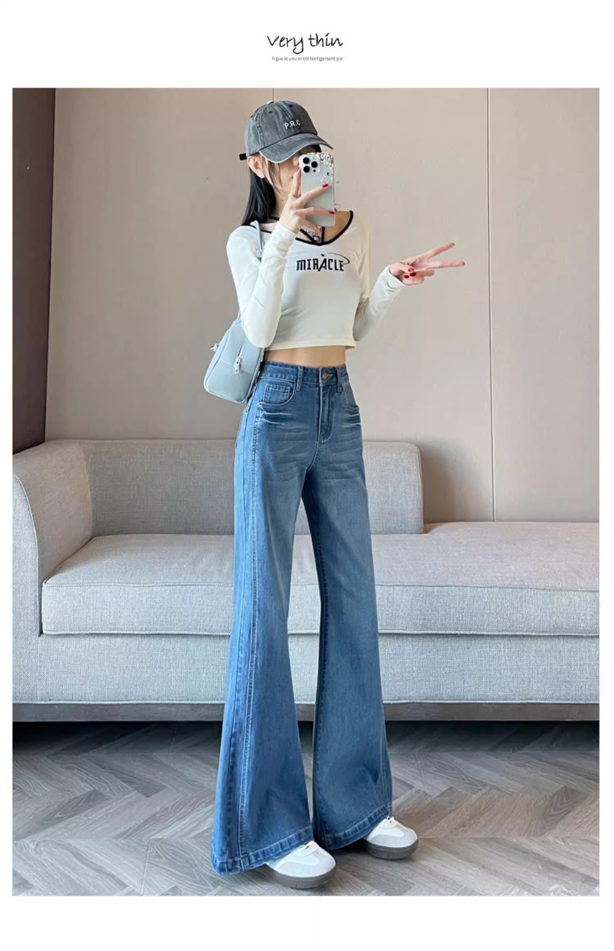 蓝色复古弹力微喇牛仔裤女2025秋季流行超火宽松遮肉阔腿喇叭裤子