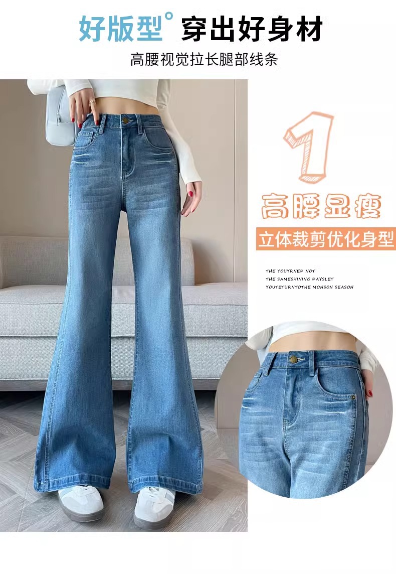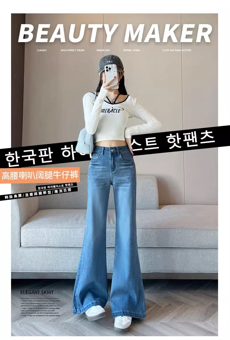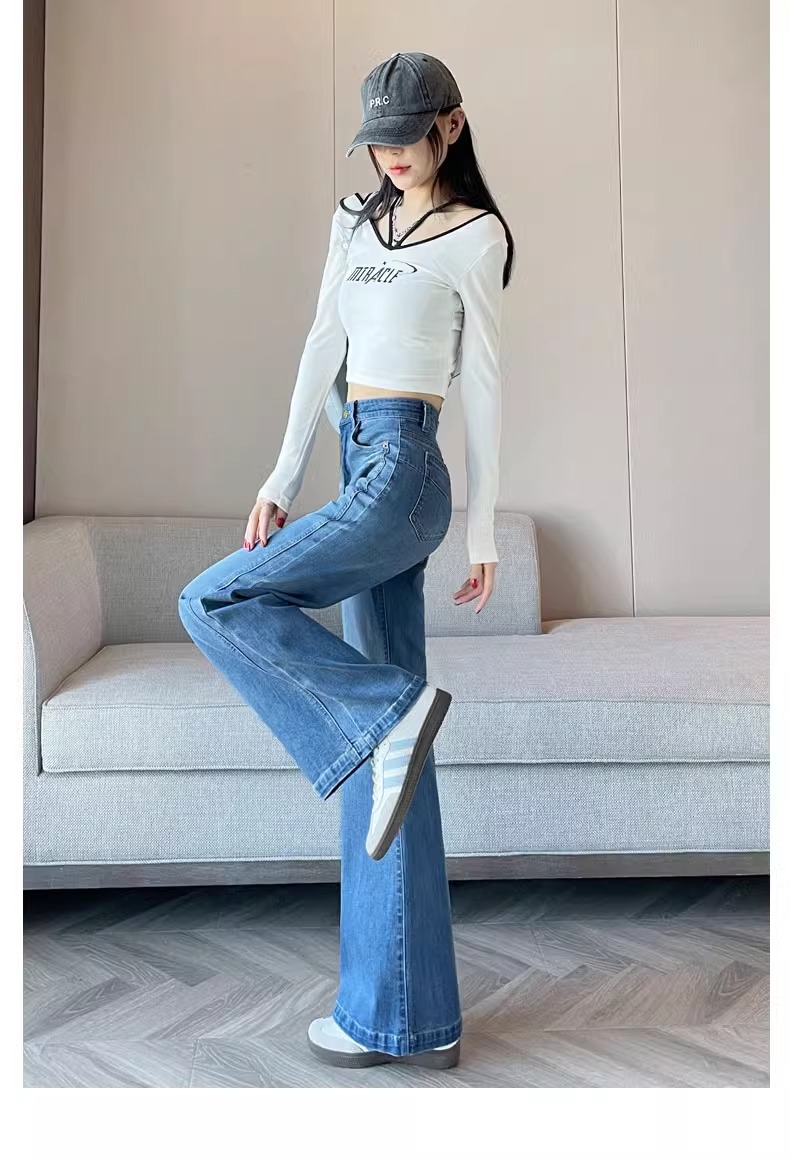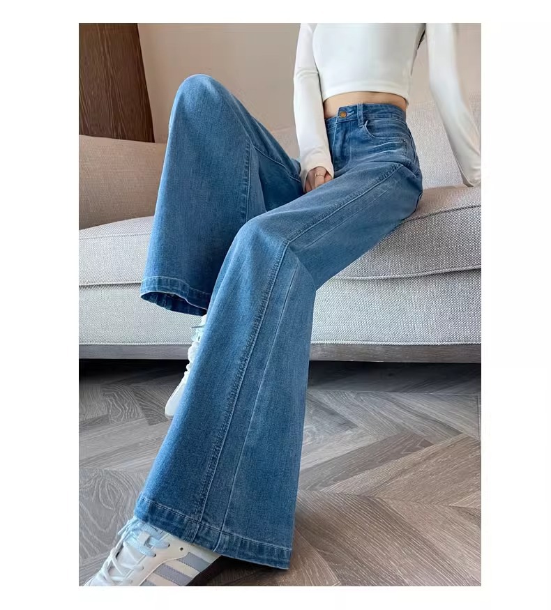 アメリカのレトロなミニラッパのジーパンの女性2025年の春の服装の新型のハイウエストはお尻を持ち上げて股のナシの形の体つきのラッパのズボンを遮ります。