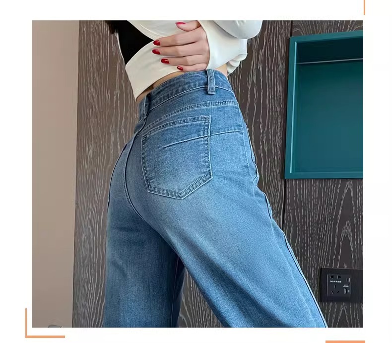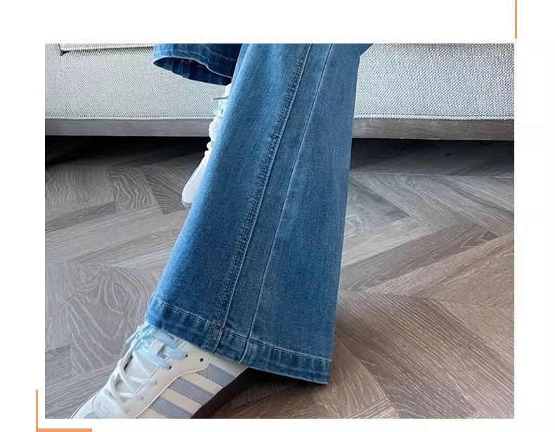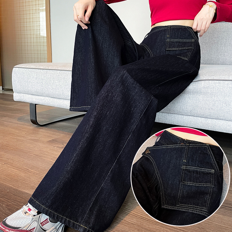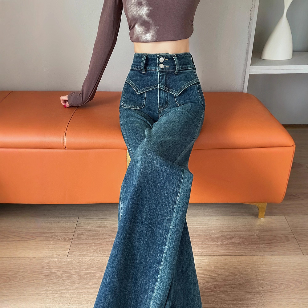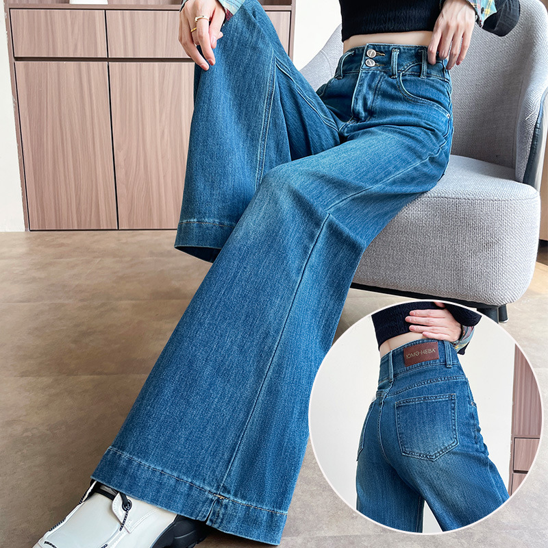 怀旧蓝弹力阔腿牛仔裤女秋装2025年新款双扣高腰直筒遮胯梨形长裤