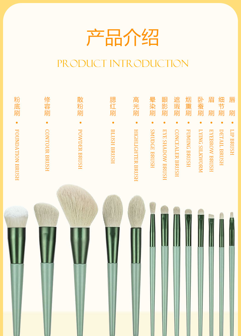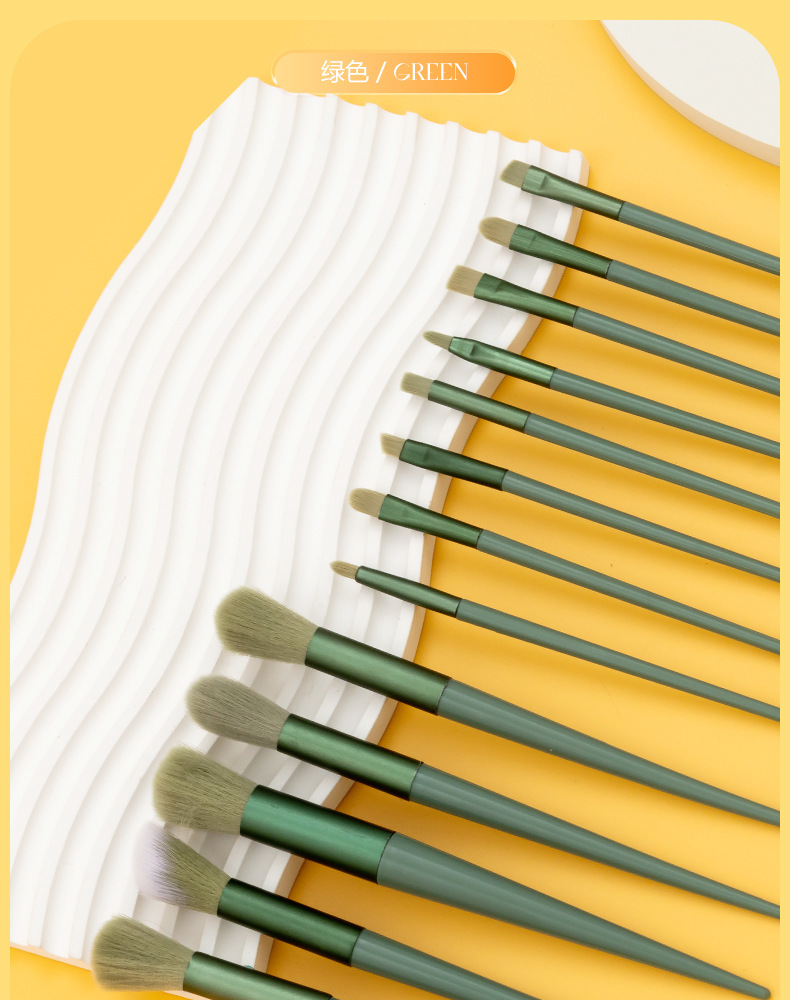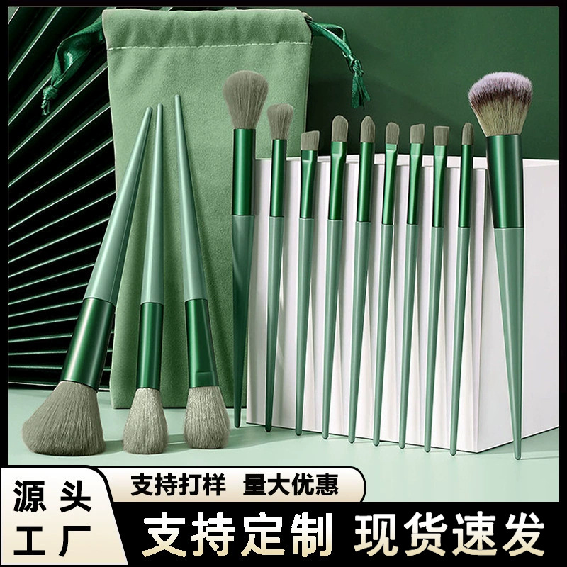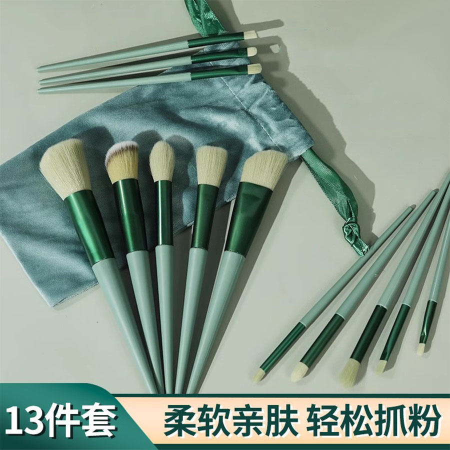 初心者向けメイクブラシ13本セット、ルースパウダー、アイシャドウ、リップコンシーラー、チーク、ファンデーション、柔らか毛の美容ブラシ、四季緑ブラシ