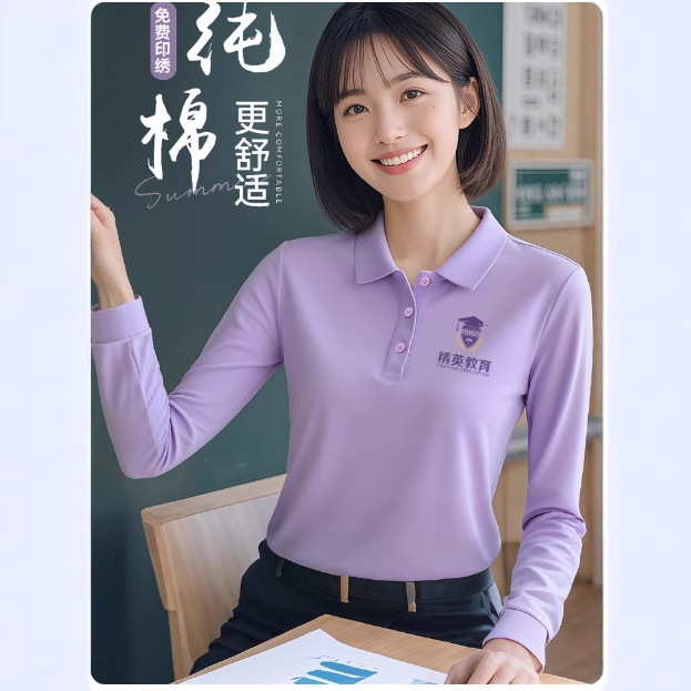 紫色纯棉工作服定制polo衫印logo企业教培团体文化衫工装长袖刺绣