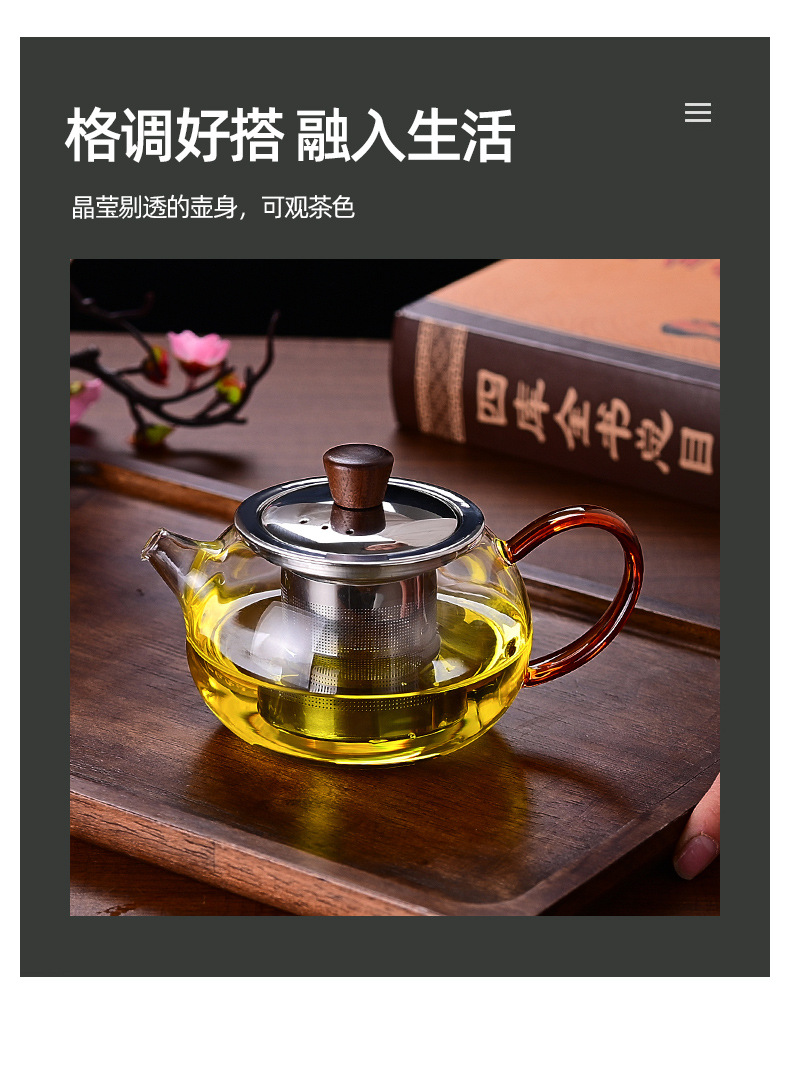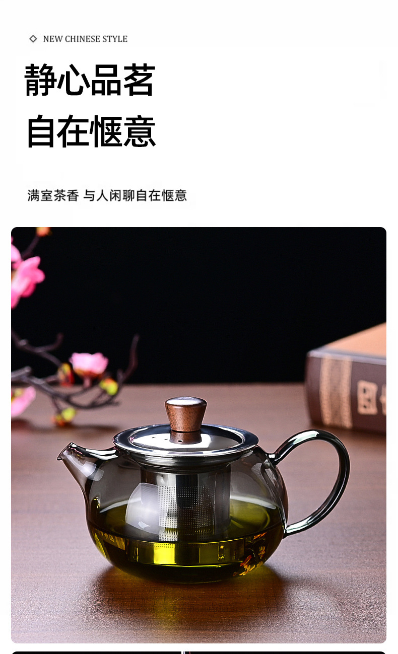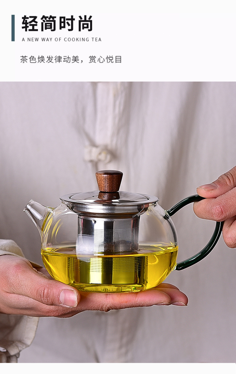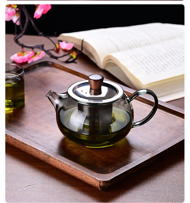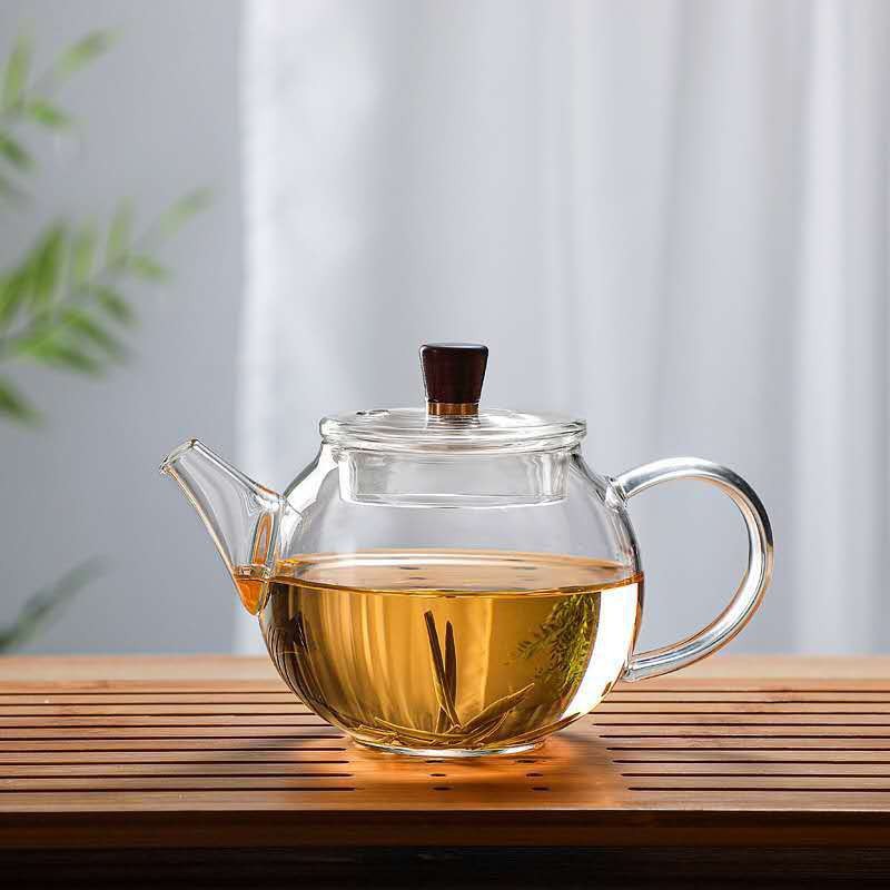 ガラス製ティーポット、高ホウケイ酸ガラス、木製蓋、家庭用花茶ポット、小容量、功夫茶器、茶葉と茶水分離