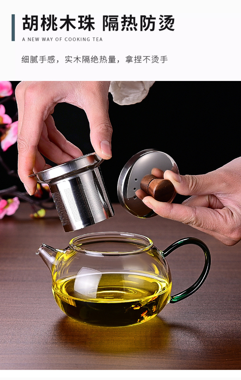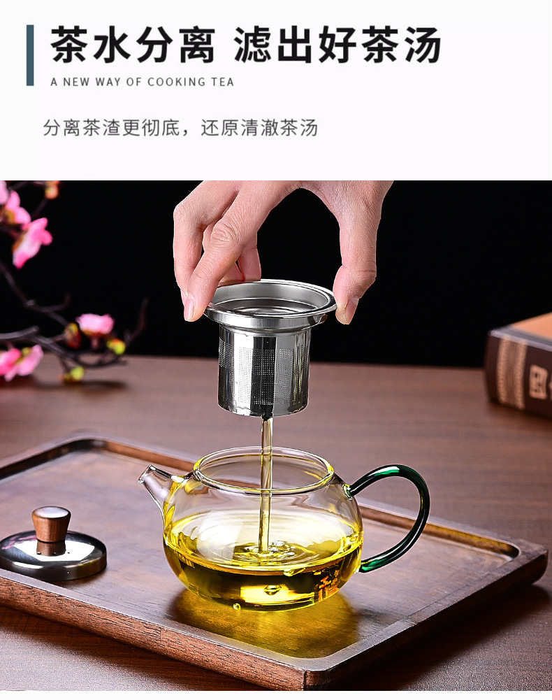 翡翠ハンドルガラスティーポットステンレス鋼フィルター煮沸ティーポット高ホウケイ酸ガラスティーポットホームオフィスフラワーティーセット