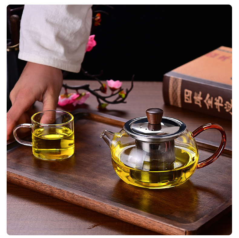 小さなティーポット紅茶泡厚いガラス泡ティーポット高温耐性ステンレス鋼木製ビーズフィルター透明カンフーティーセット