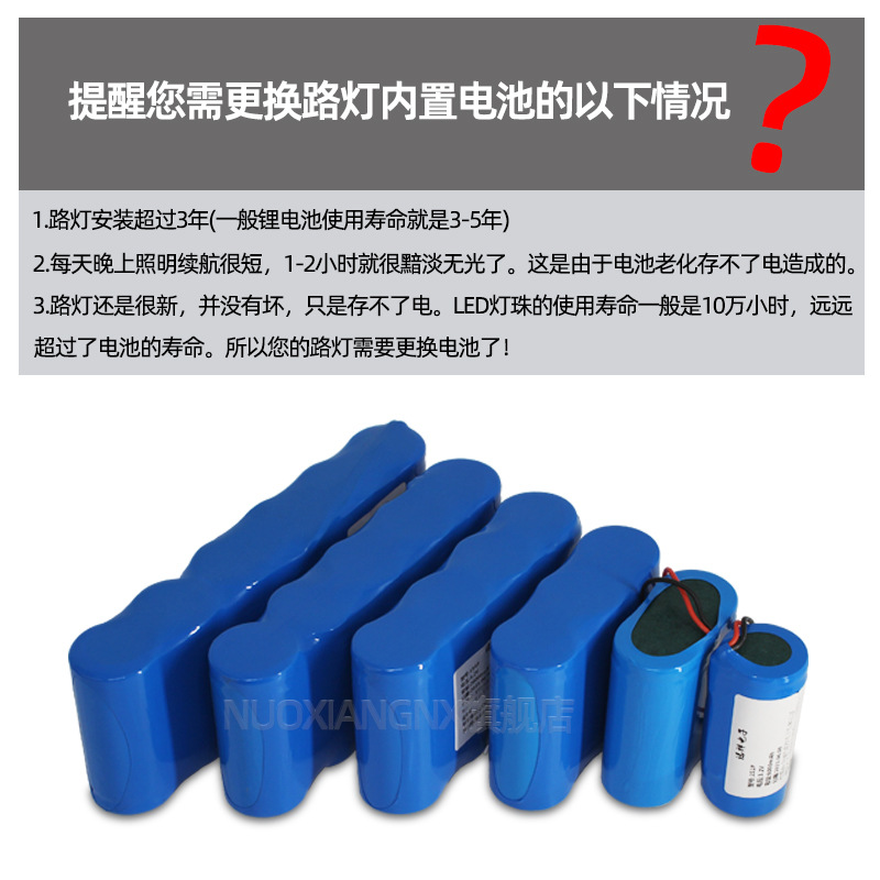 注意:灯板上写的是6V 5V 以下都是可以通用3.2V的电池组的,你看看电池仓能装多少节就买多少节的电池,越多使用时间越长.......,如果灯板上写的是6.4V 7.4V 11.1V 12V的,可以和客服联系,太阳能灯专用电池,耐用时间长,寿命长,有不同形状,可以订制。