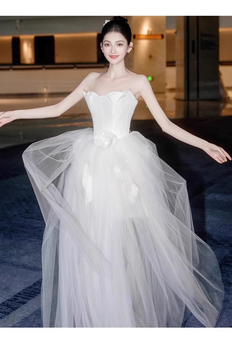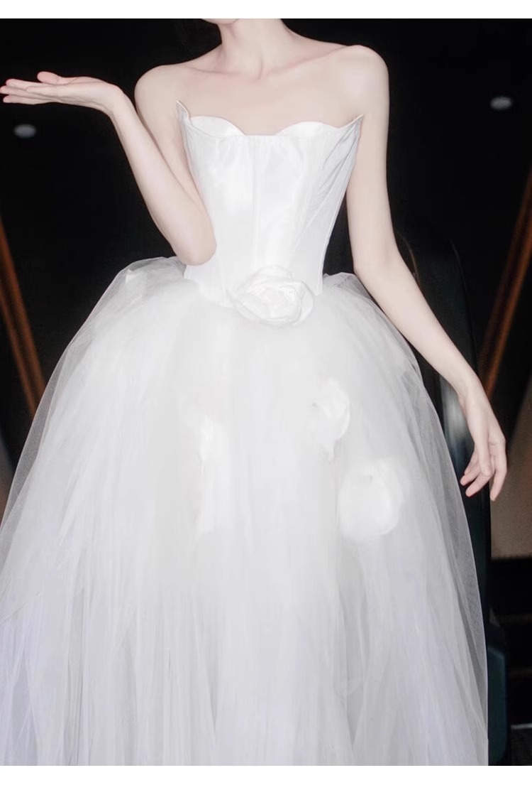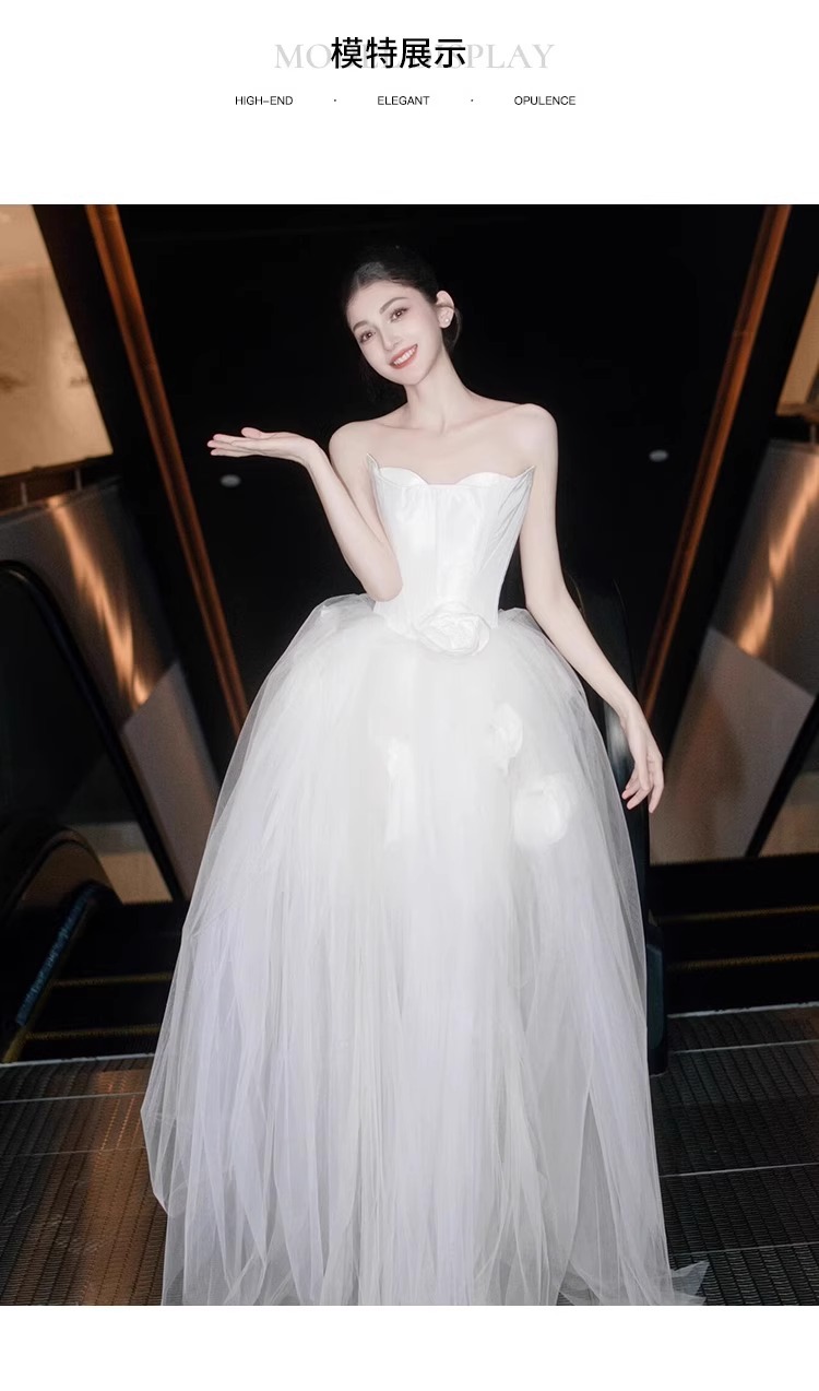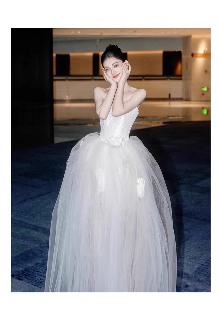 フランス式の胸の軽いウェディングドレス2025年の新型の婚約気質の花嫁の白い外出の紗のドレスの旅は客を迎えます。