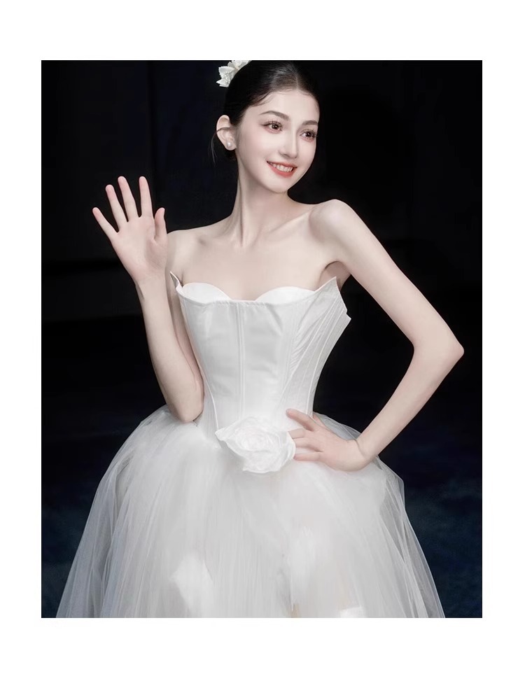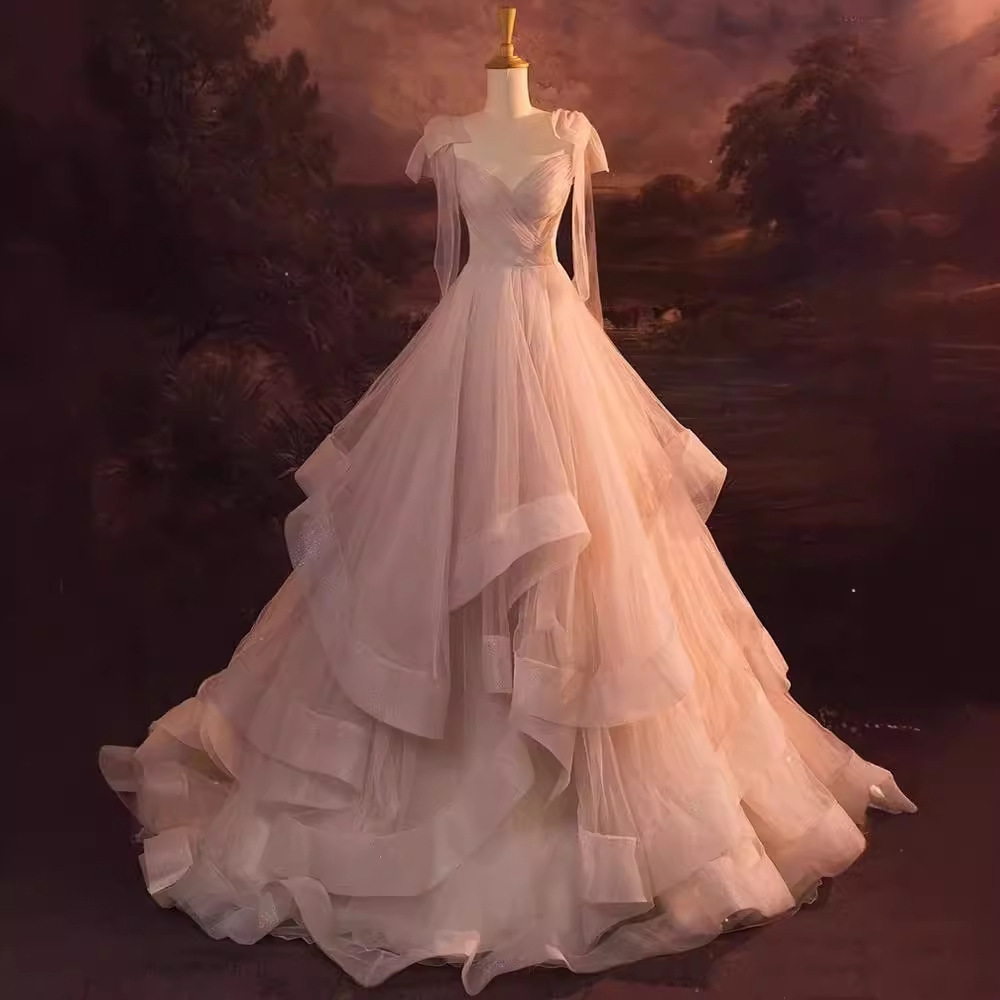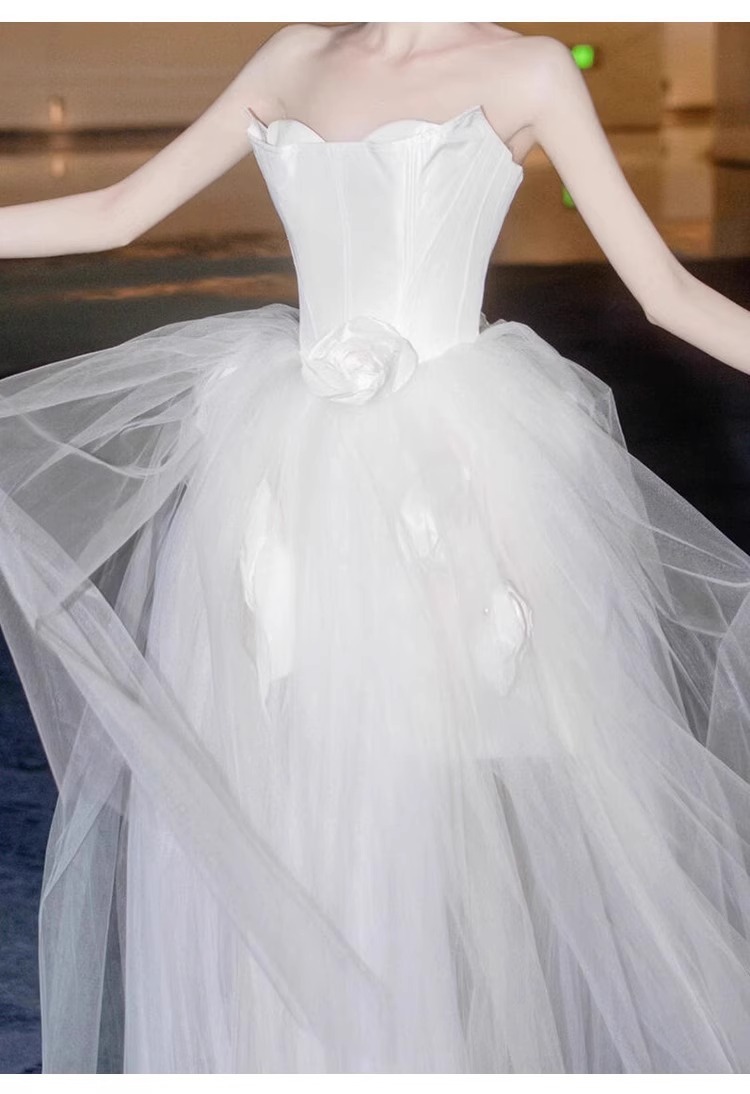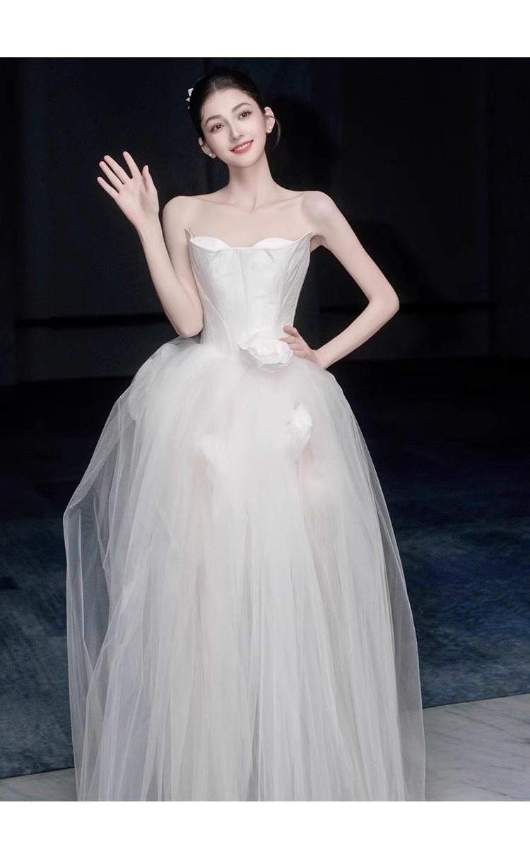 フランス式の胸の軽いウェディングドレス2025年の新型の婚約気質の花嫁の白い外出の紗のドレスの旅は客を迎えます。