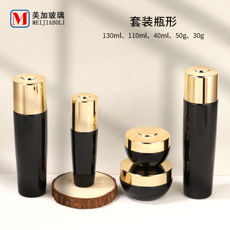 現物高級黒色スキンケア品セット瓶電化アルミガラス男性水乳精華液クリームガラス瓶