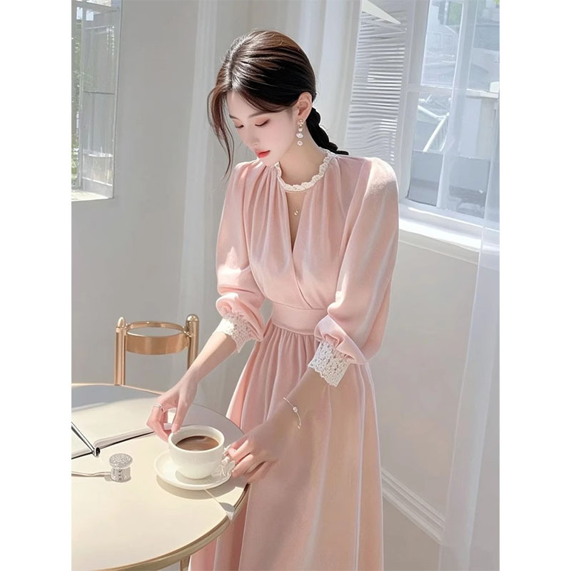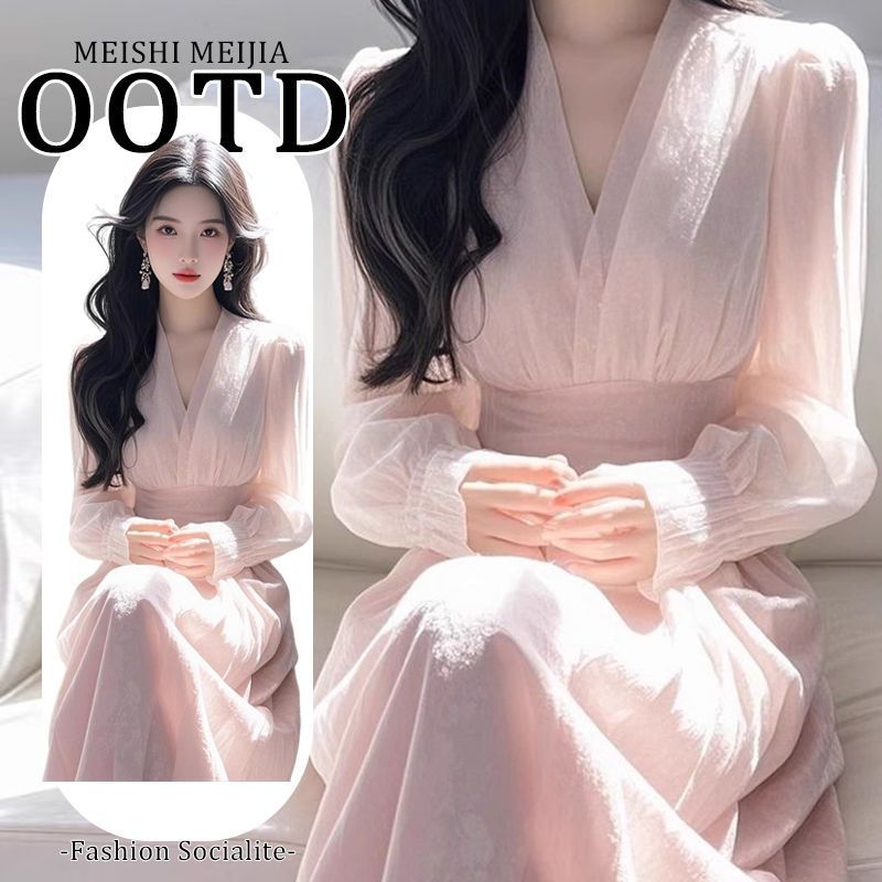 2025春フレンチロングスカート、美しくユニークな気質、セレブの女神スタイル、女性用のハイエンドピンクウエストドレス